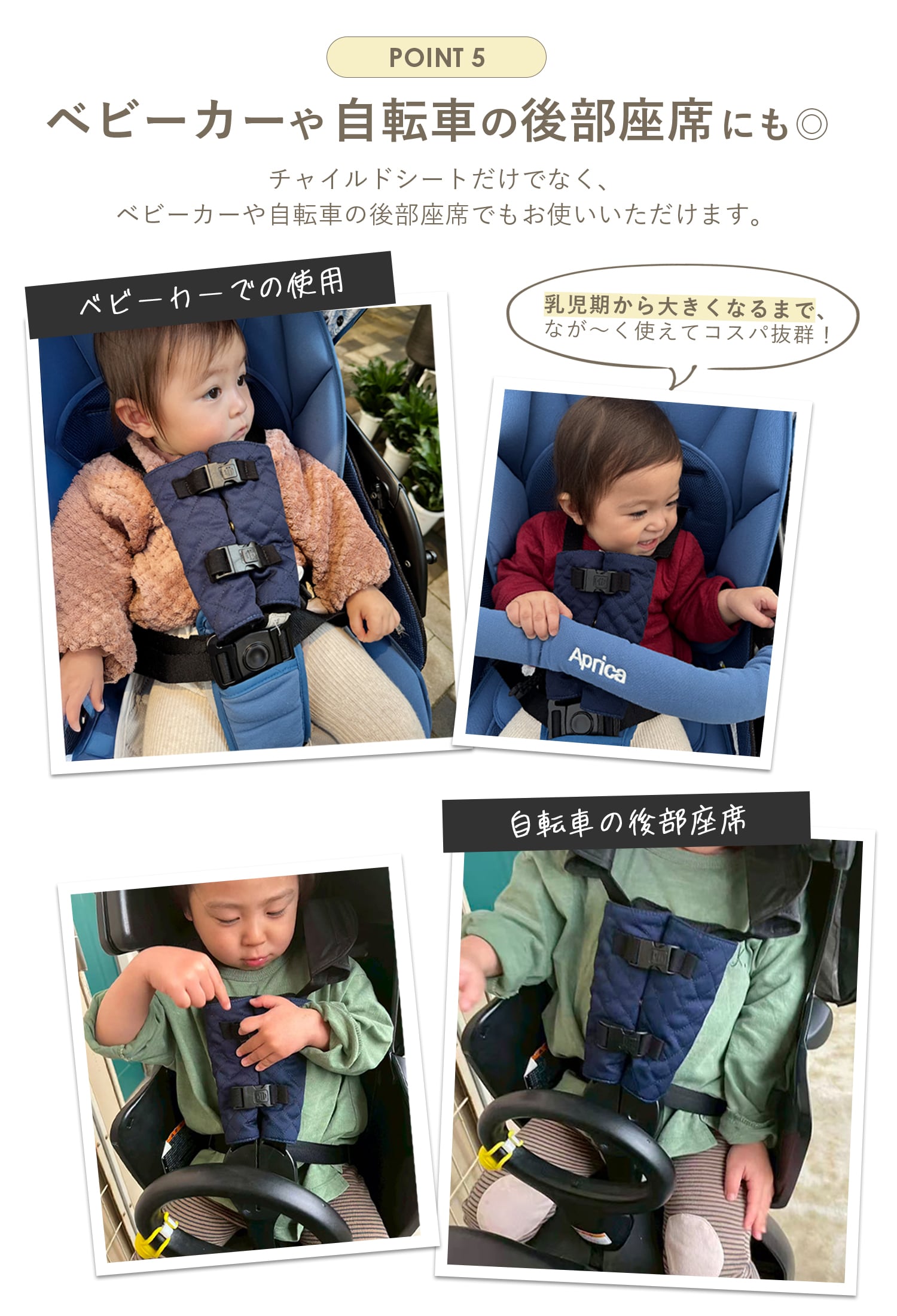 上から巻いて取り付けるので、チャイルドシートの種類を問わずにご使用いただけます。