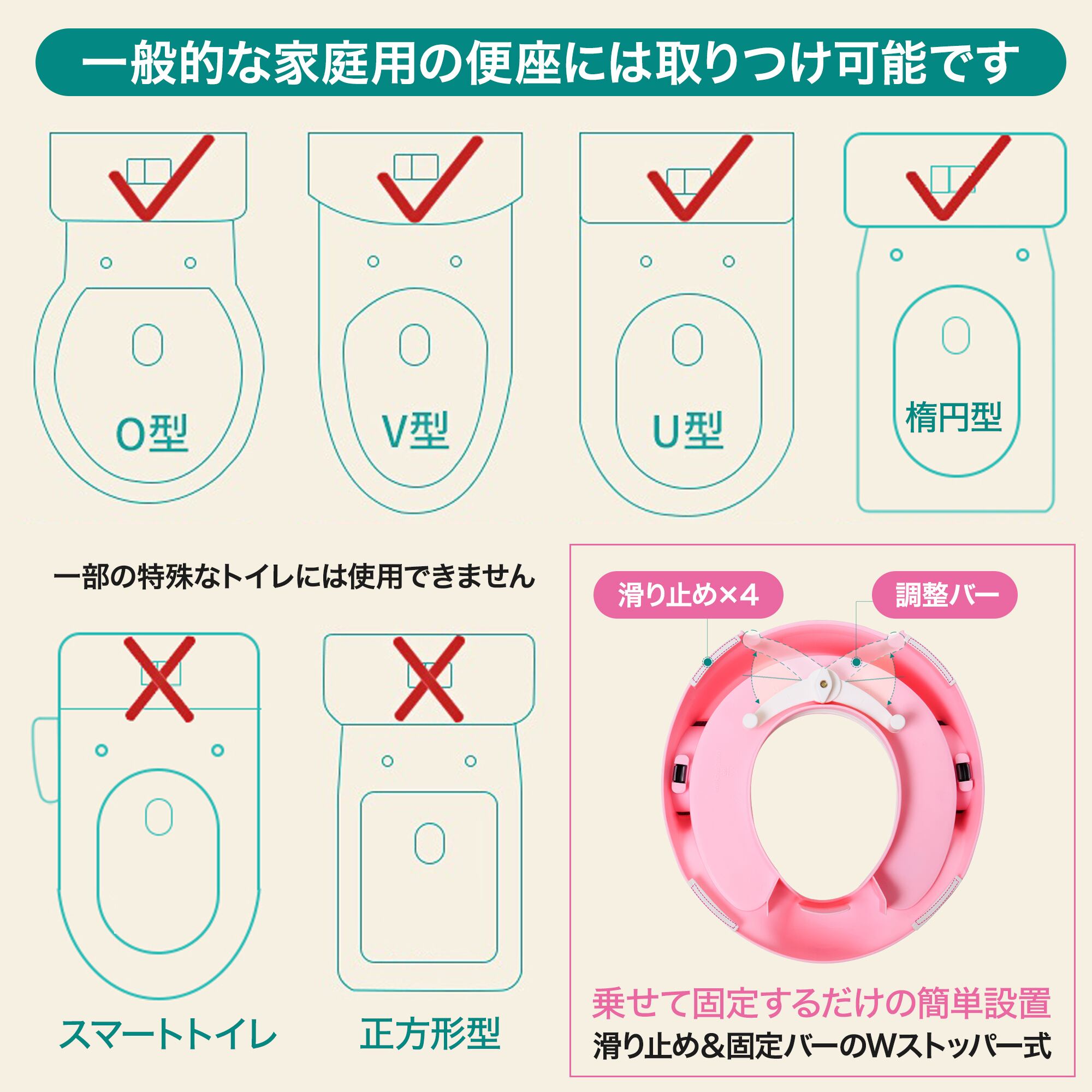 補助便座を乗せてバーで調整して固定するだけ、4ヶ所に滑り止めがついてズレにくい仕様。
