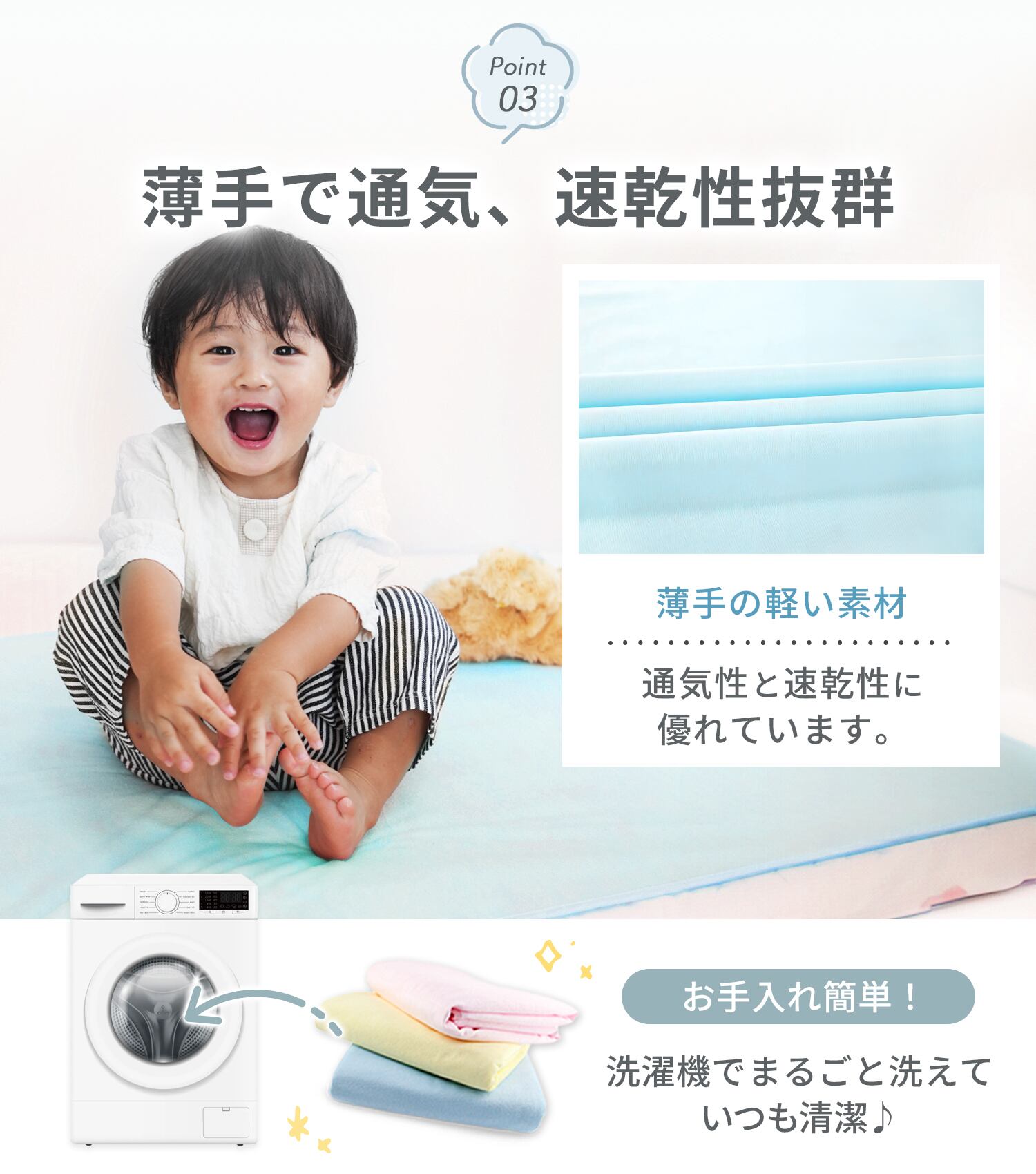 薄手なので、お洗濯時もかさ張らず、ネットに入れて洗濯機で丸洗いできます◎