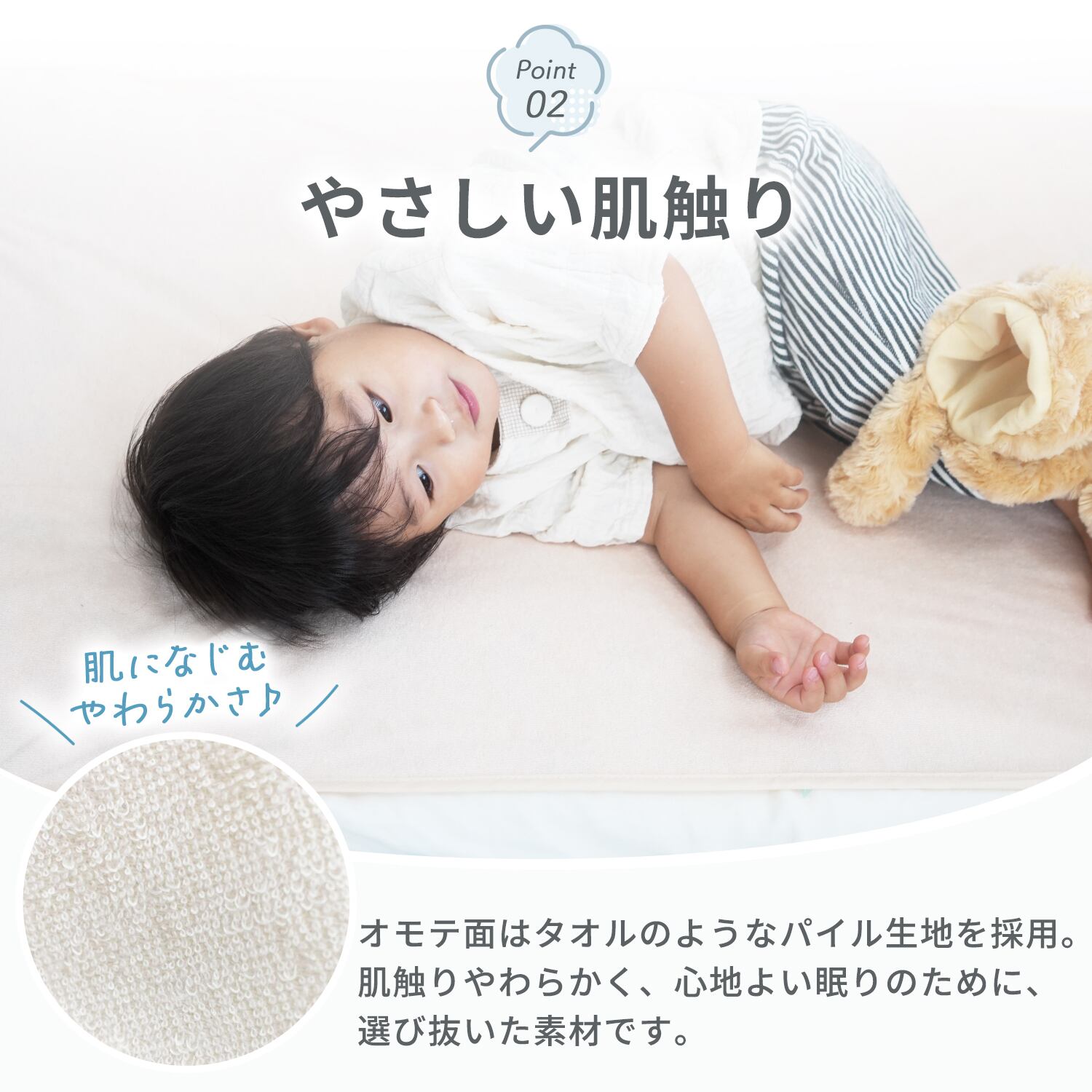 表面はサラサラの綿素材。寝汗をかいてもベタつかず、さらっとした気持ちの良い肌触りです。