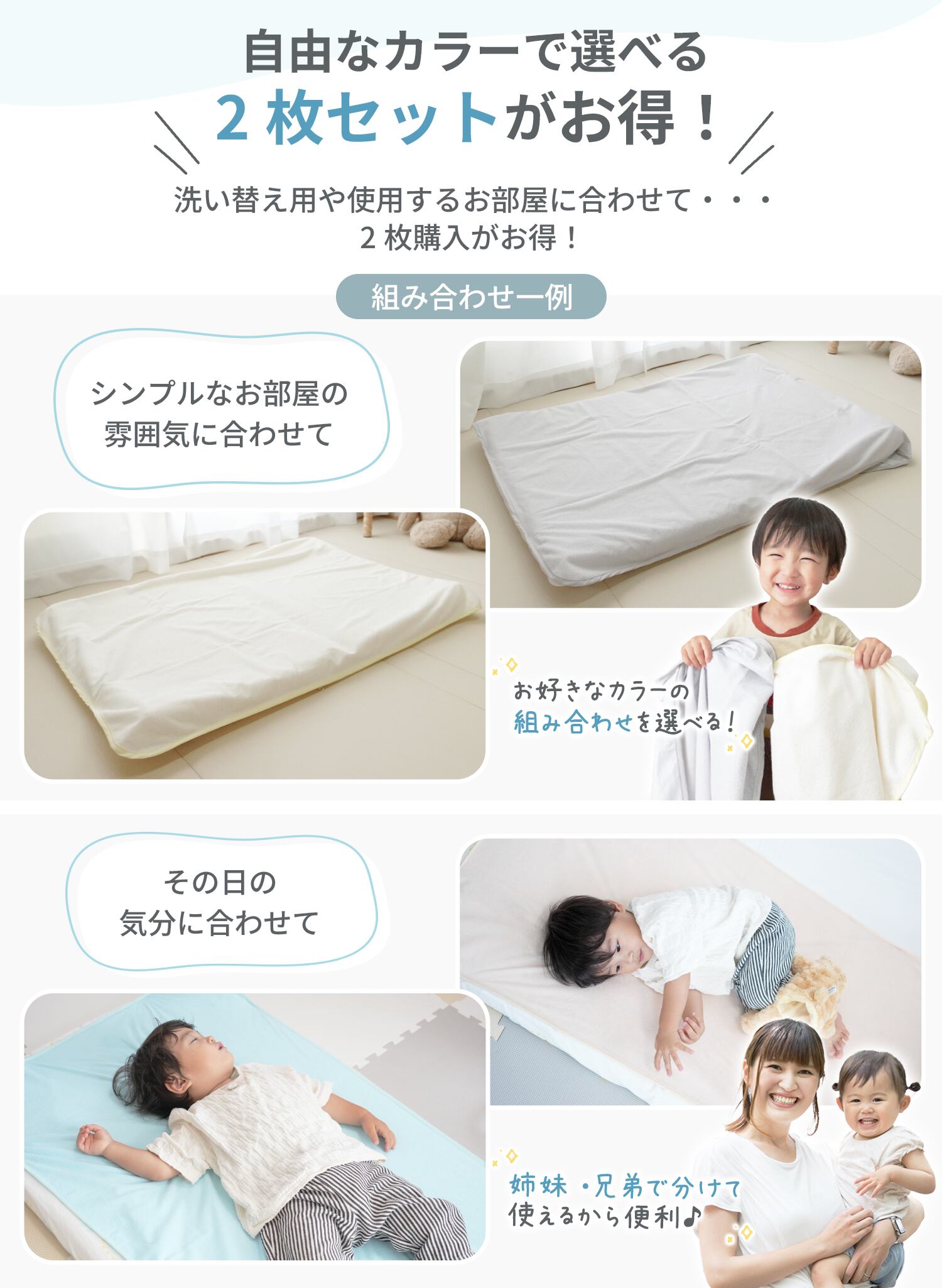 ※ゴムは緩めの作りなので、厚いマットレスには合わせやすいですが、薄いマットレスやお布団にセットする場合は、ゴムを結んできつめにしていただくなど、ご家庭の寝具に合わせて調整しながらご使用ください。