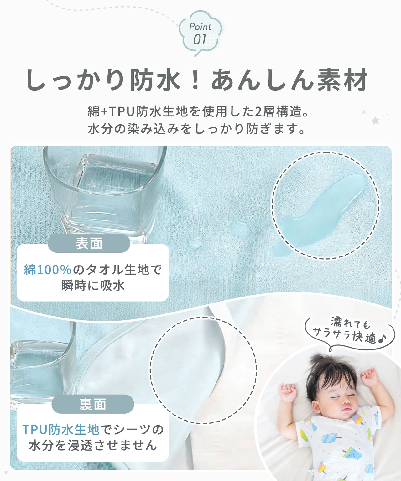 お子様のおねしょ対策はもちろん、介護や寝汗対策、ペットのお気に入りのソファに敷くなど、毎日大活躍の防水シーツです。