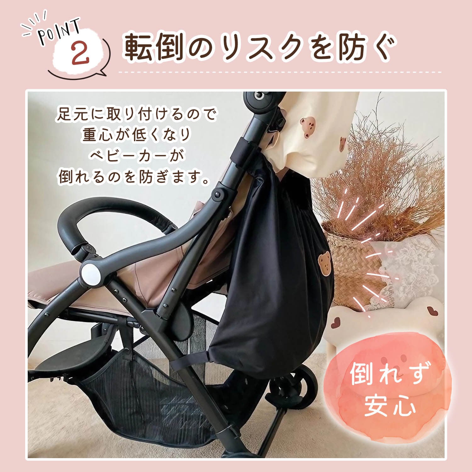 足元に取り付けるので、重心が低くなり、ベビーカーが倒れるのを防ぎます。