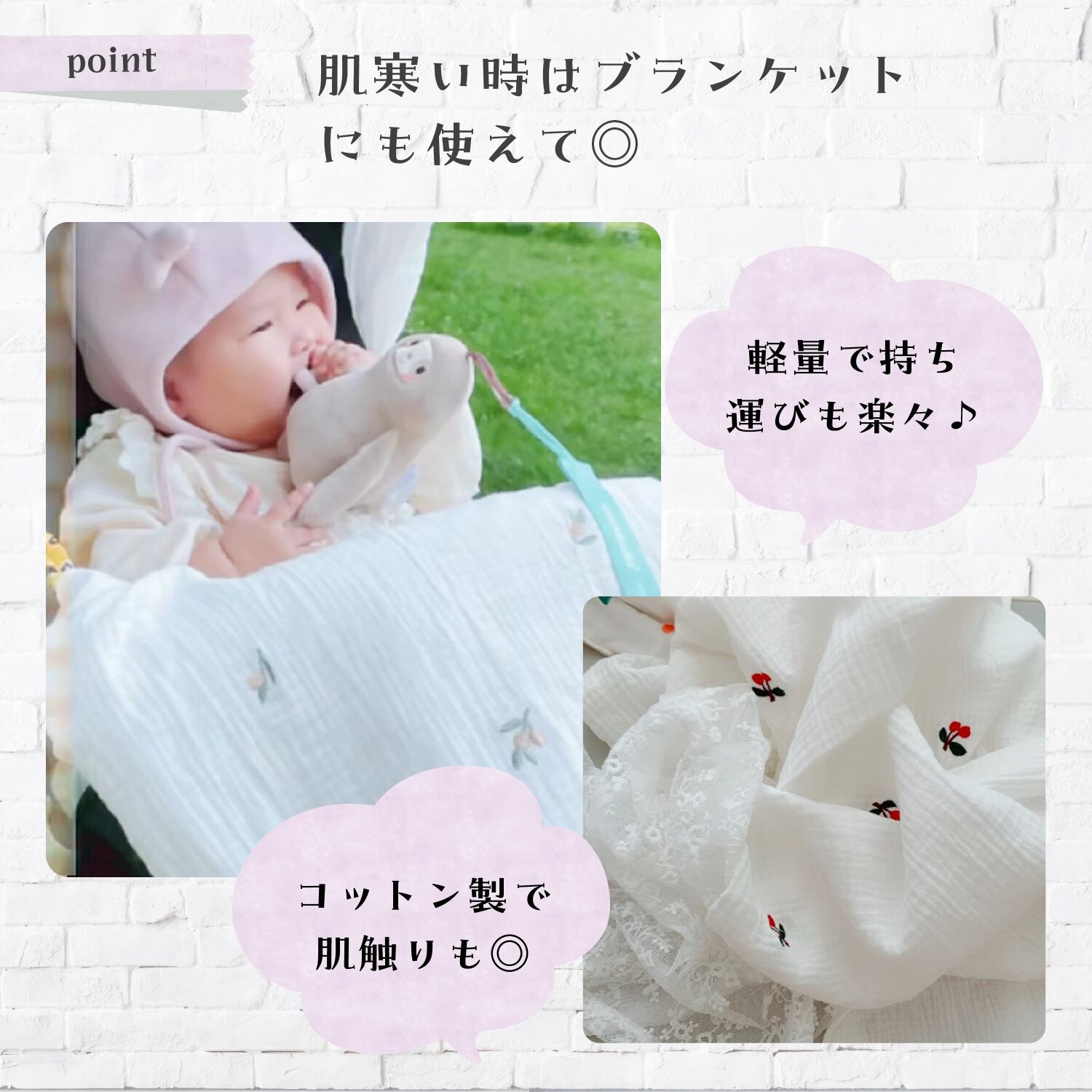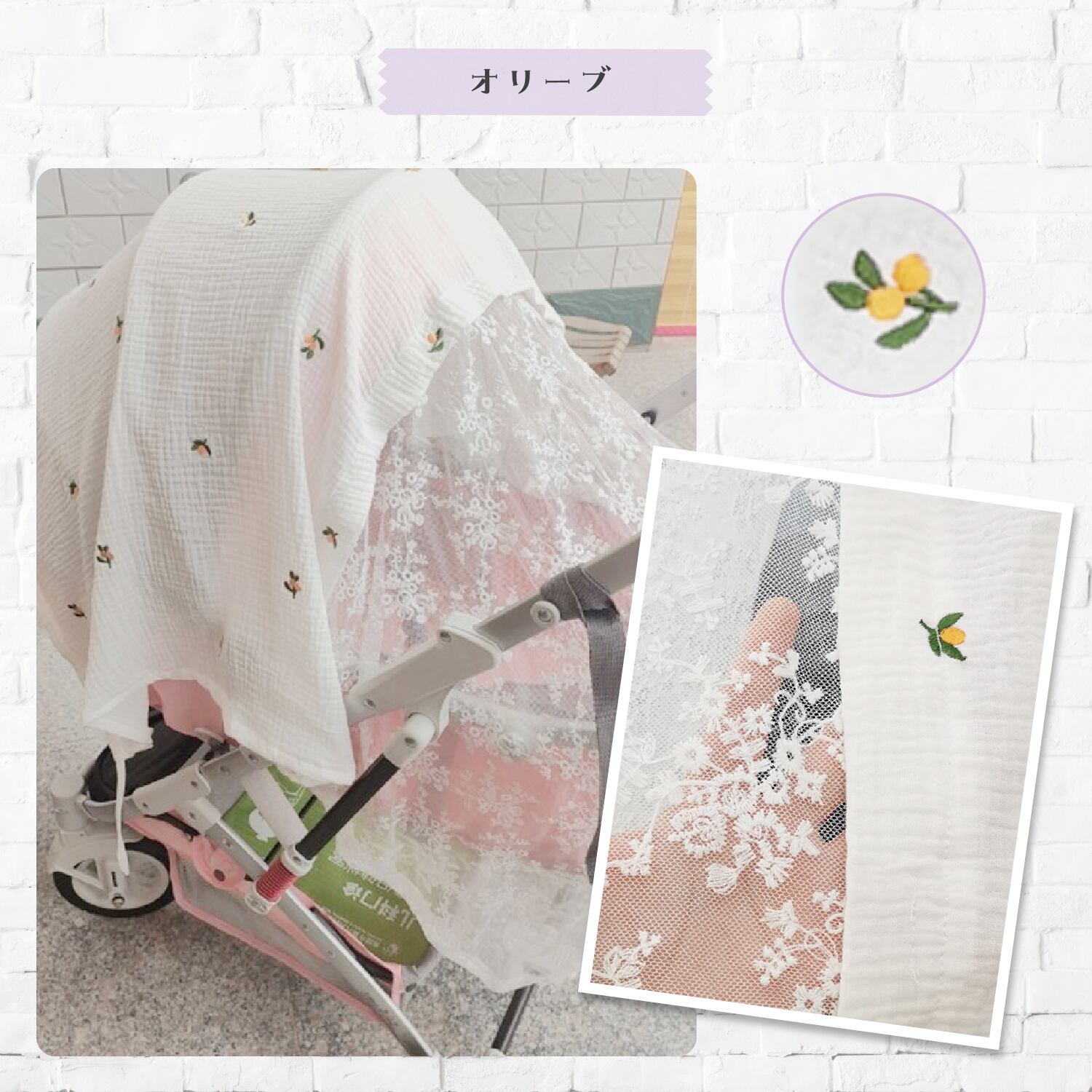 日除けや虫除けとしてだけでなく、冷房対策やお昼寝時など、さっと折りたたんでブランケットとしても使用でき便利です。