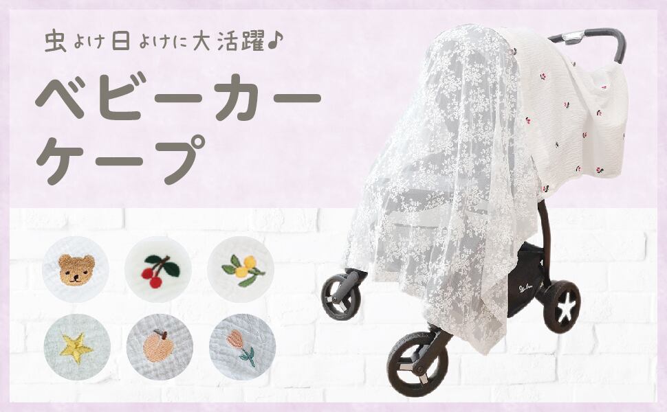 ベビーカーの日除け、虫よけになるかわいいケープ。上2か所のひもが付いていて、ベビーカーに結び付けて使用します。