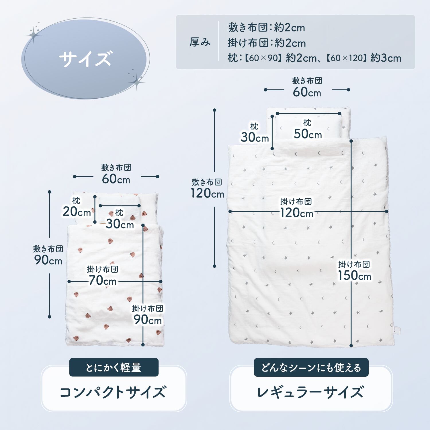 芯(布団、枕本体):カバー 綿100%、中綿 ソイコットン20%、ポリエステル80%