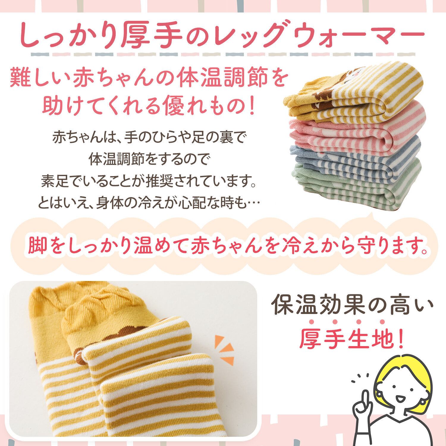保温効果に優れた厚手のレッグウォーマーです。赤ちゃんにとって快適な素足で過ごしながらも、脚をしっかり温めて冷えから守ります。