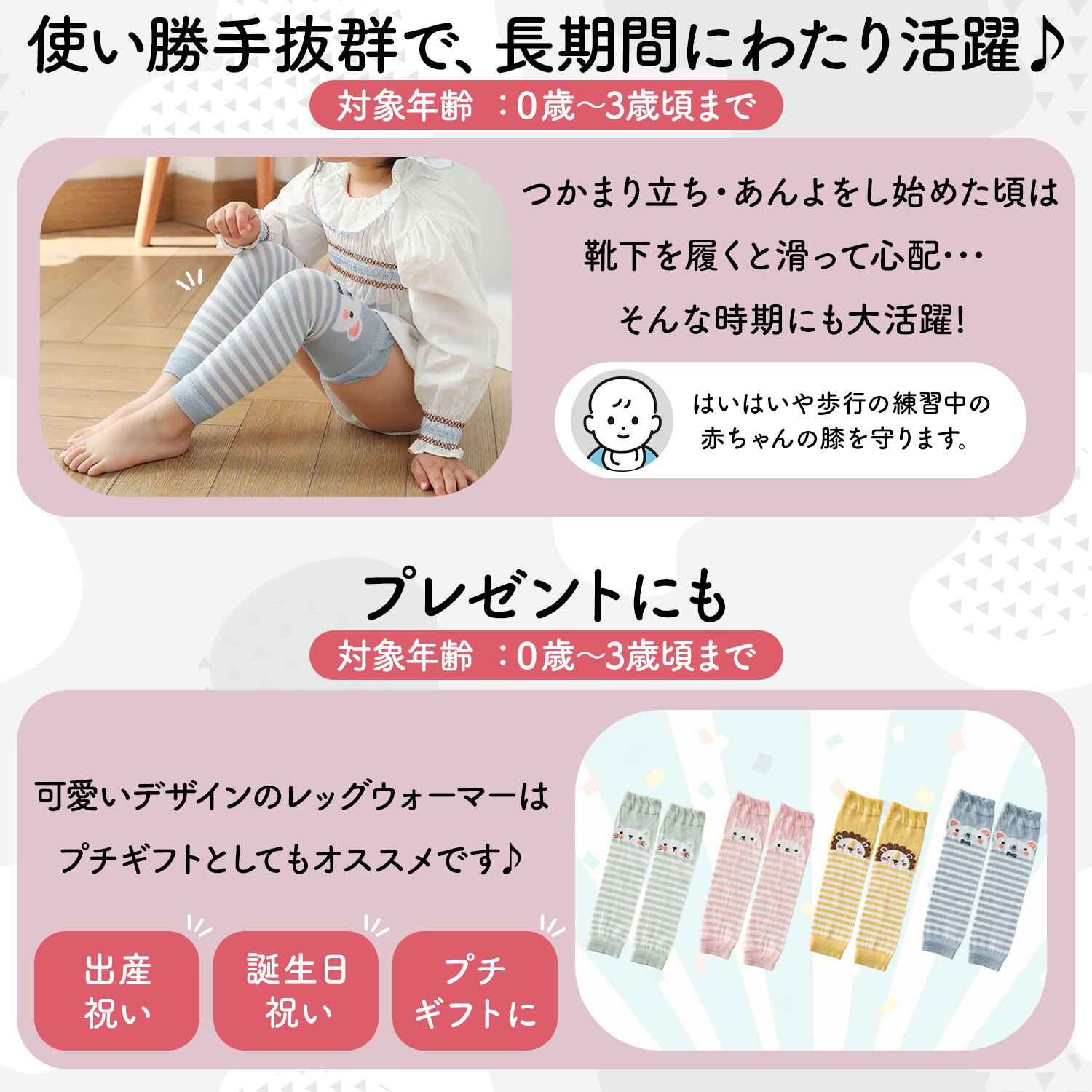 ハイハイをたくさんする赤ちゃんのお膝を摩擦から守ります。優しくフィットして動きやすく、足が出ている為つかまり立ち・あんよの練習の際にも滑りにくいです。
