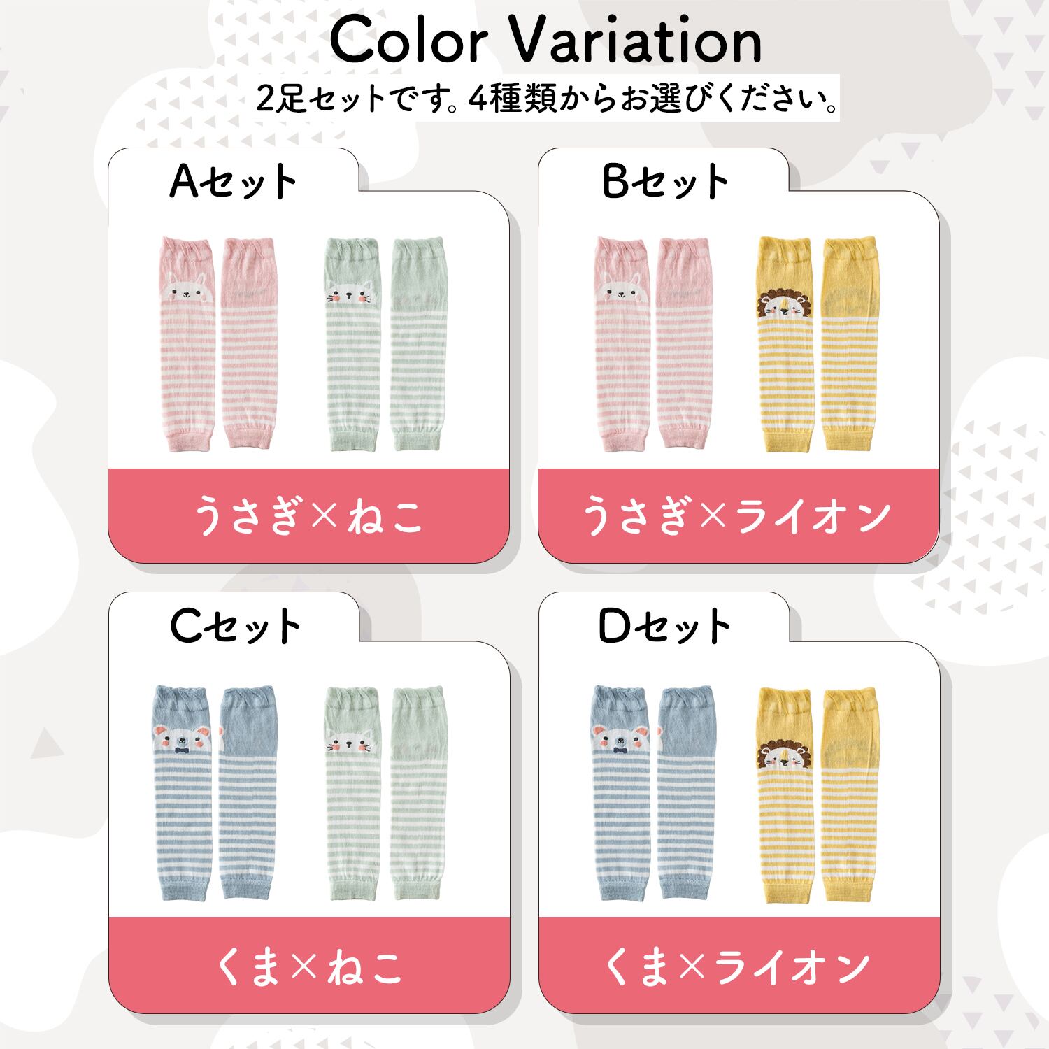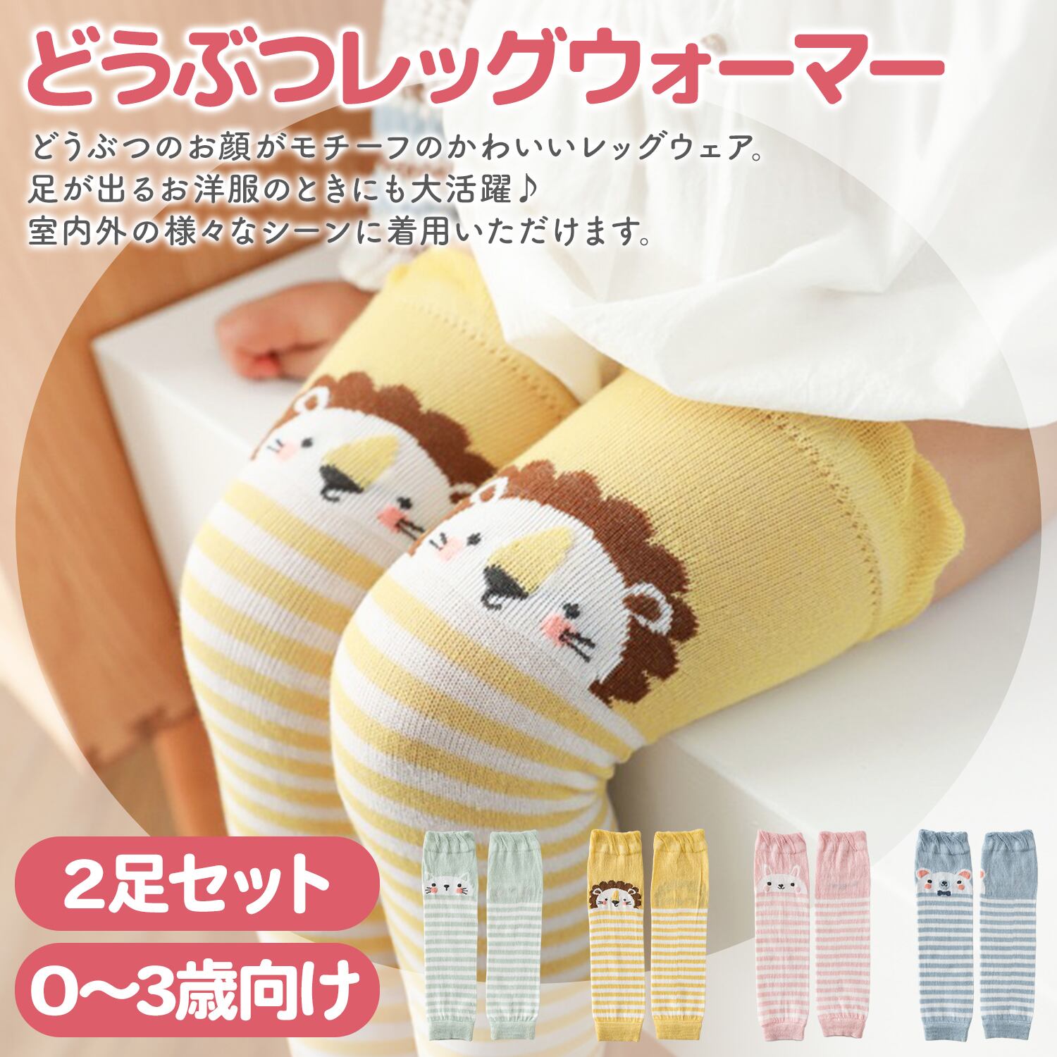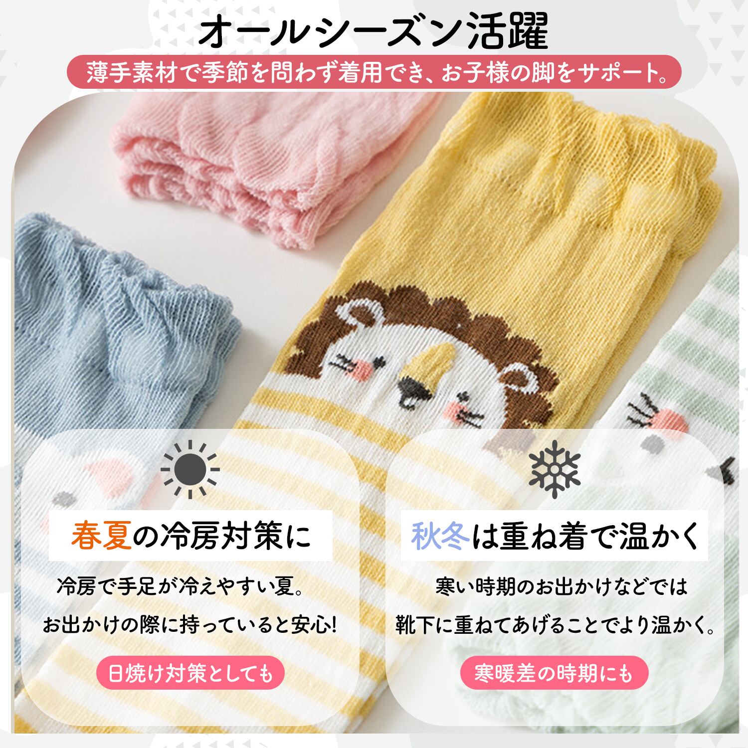 季節を問わず着用できる薄手のレッグウォーマーです。赤ちゃんにとって快適な素足で過ごしながらも、脚をしっかり温めて冷えから守ります。