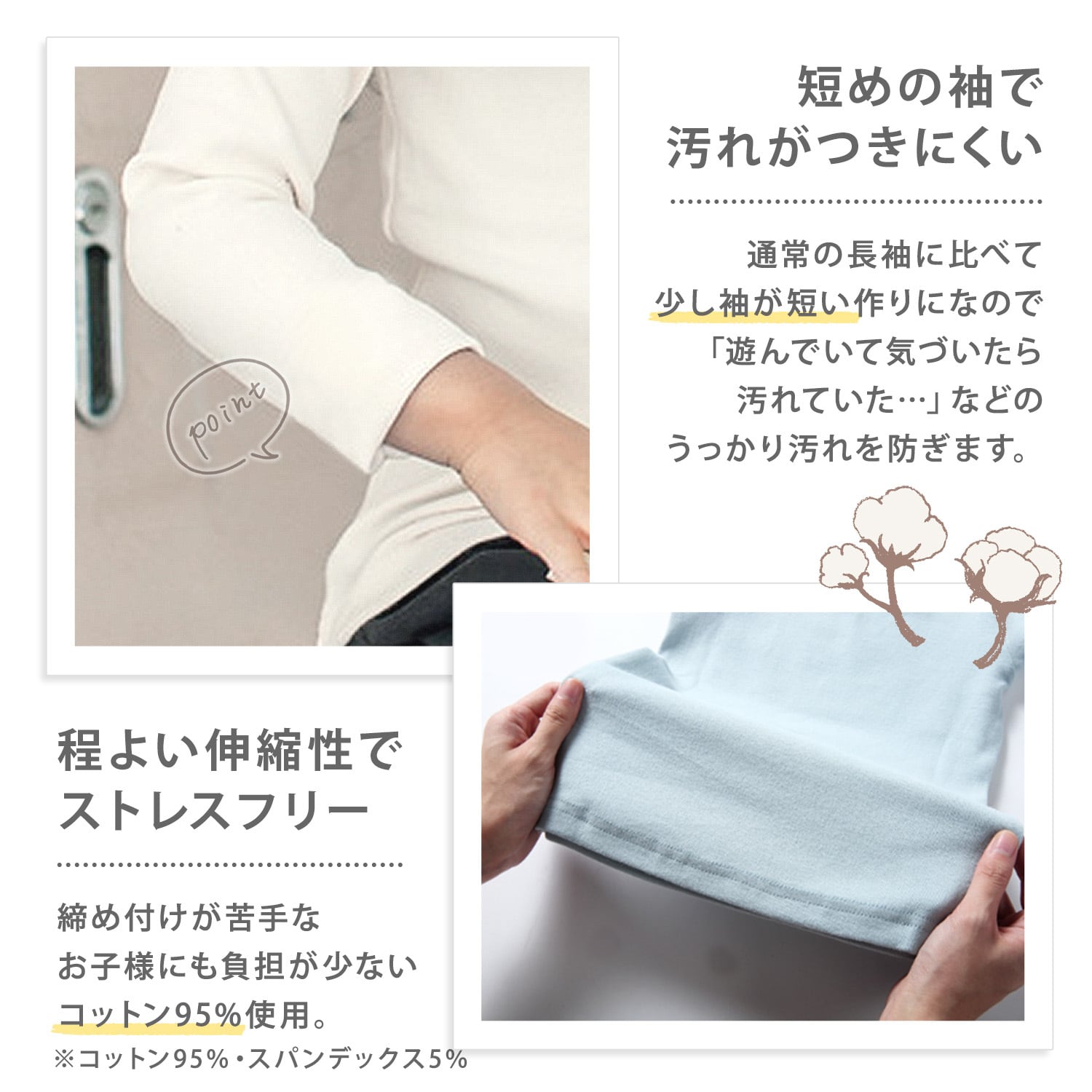 コットン95%で伸縮性があるので、衣服の締付けが苦手なお子様にも負担が少ない!