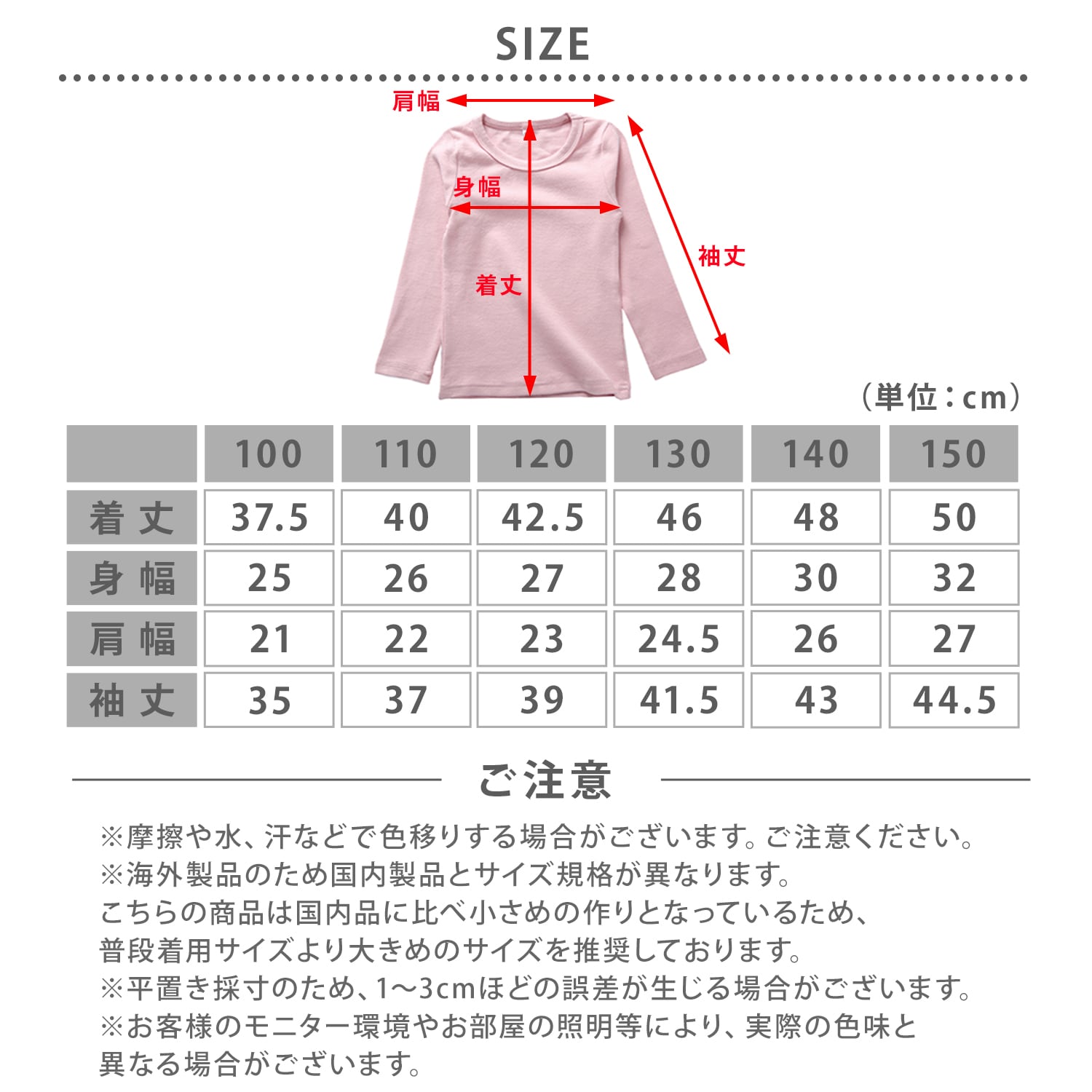 平置き採寸のため、1~3cmほどの誤差が生じる場合がございます。ご了承ください。