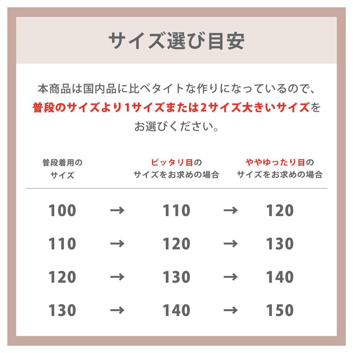 海外製品のため国内製品とサイズ規格が異なります。こちらの商品は国内品に比べ小さめの作りとなっているため、普段着用サイズよりも1サイズまたは2サイズ大きめのサイズをおすすめしております。