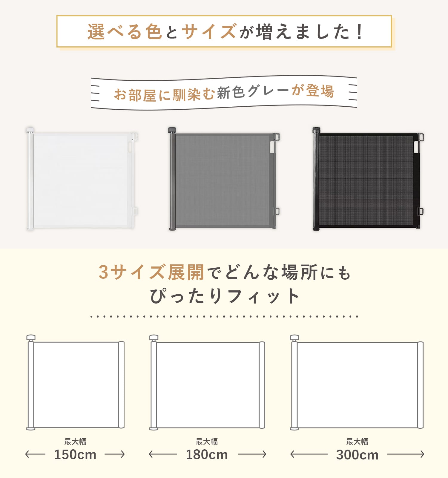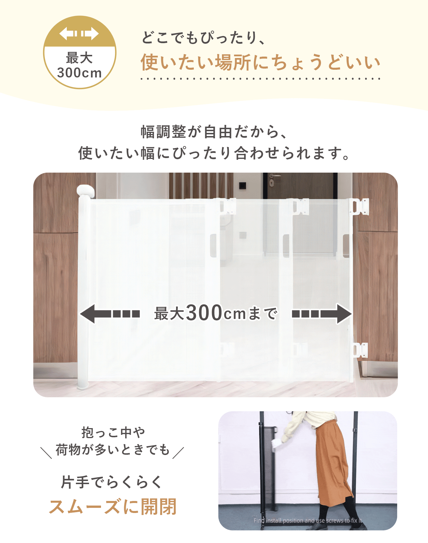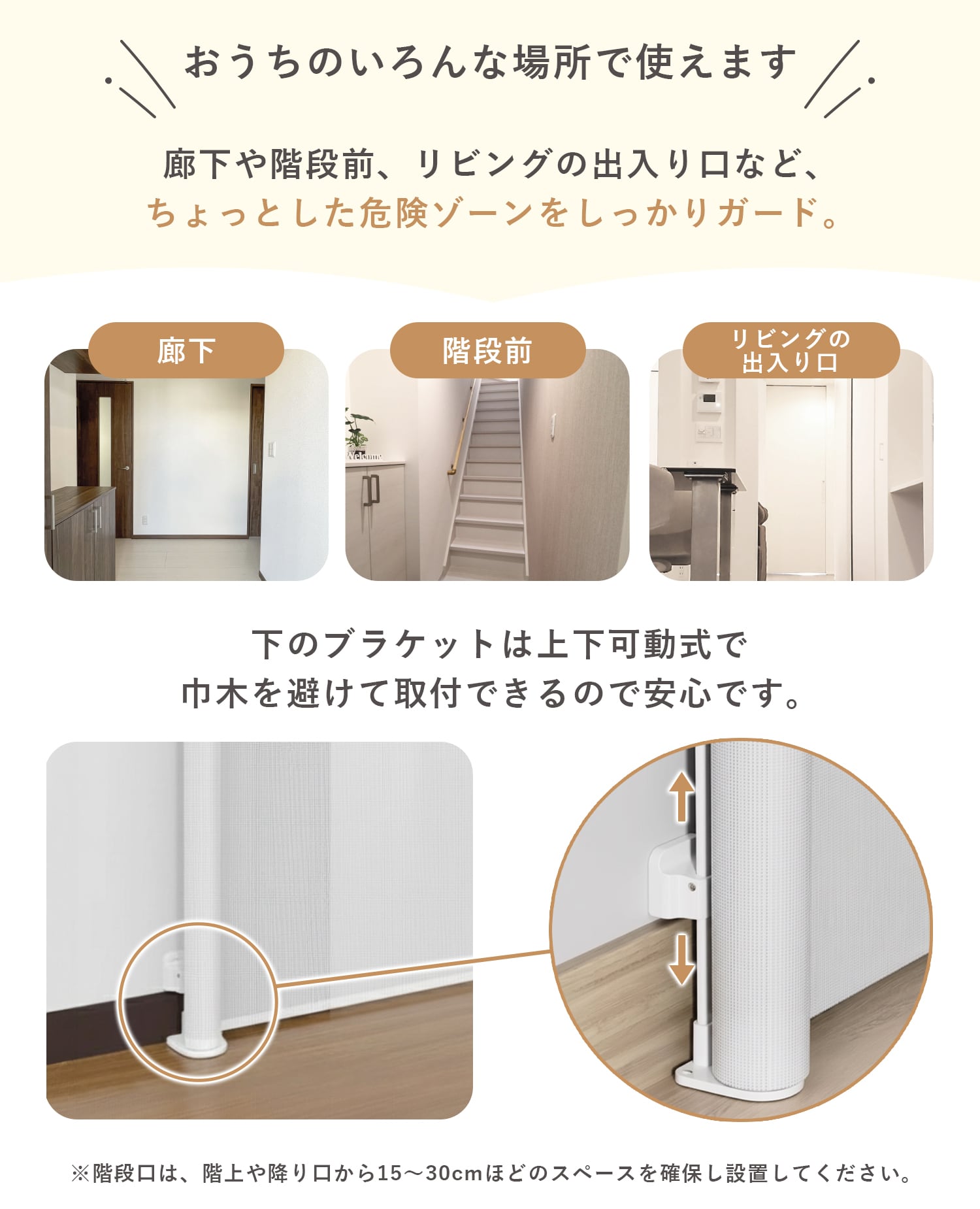 ロール式ベビーゲートなので、どんな場所でも広々とガードをする事ができます。キッチン、階段上や下、リビングの入り口など様々な危険からお子様を守ることができます。ペットゲートとしてもご使用いただけます。