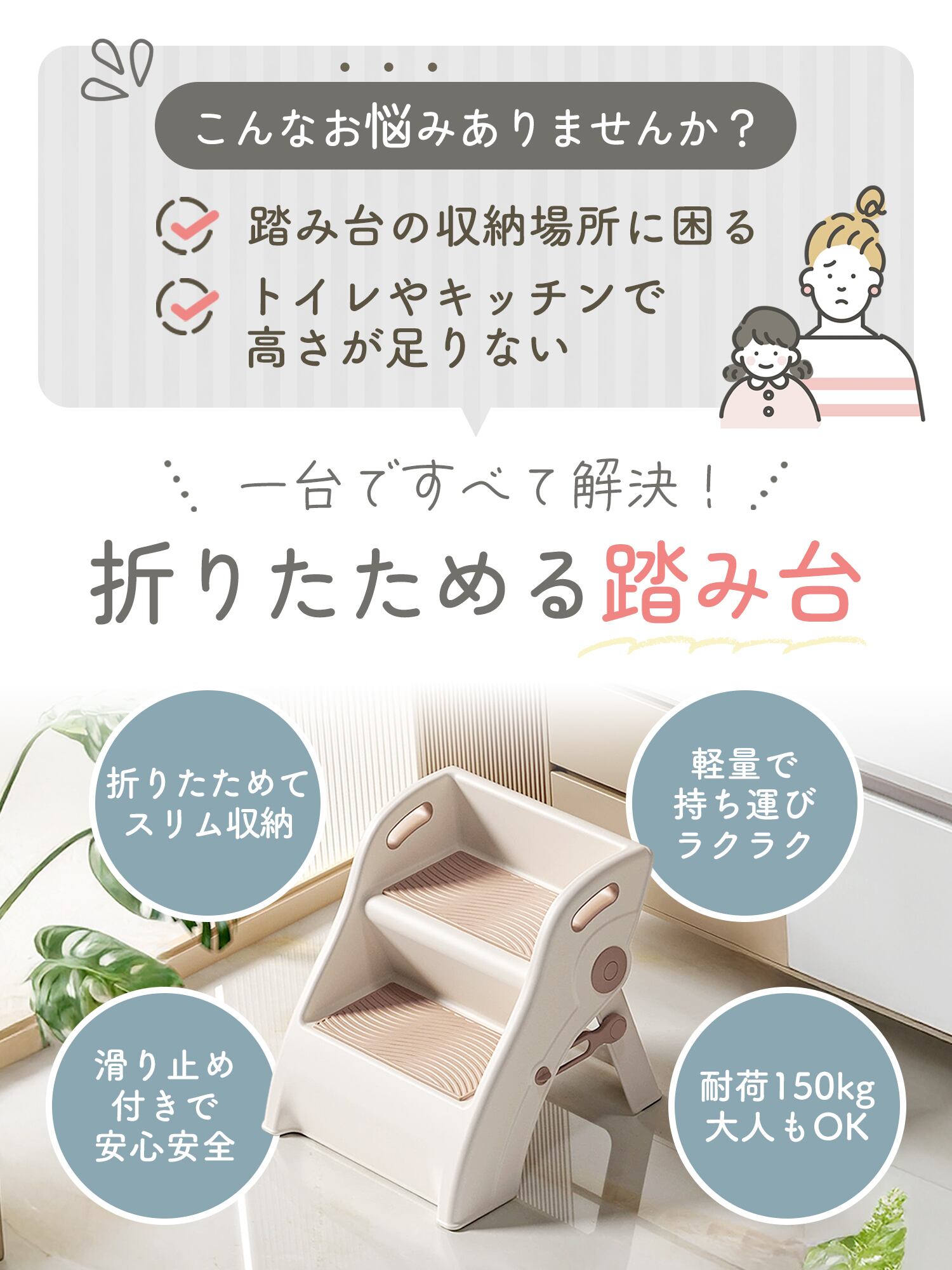 耐荷重は約150kg。軽量ながらもしっかり支えるつくりで、キッチンでの作業や高い場所の片付けなど、大人の方もしっかり実用できます。折りたたみ時のロックも装備し、使用中のぐらつきを抑えます。