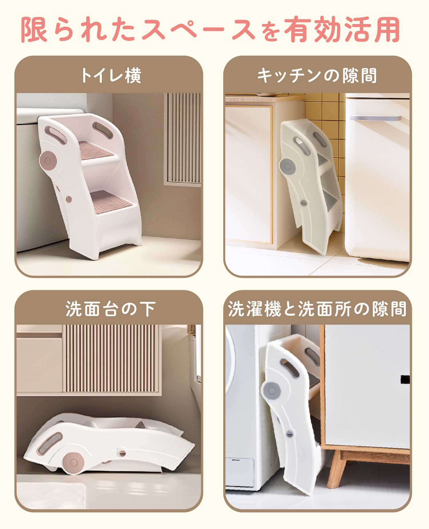 1段目は約15cm、2段目は約30cmと、小さなお子さまが無理なく昇り降りしやすい高さに整えています。トイレ、洗面台、キッチンなど幅広いシーンで活躍。トイトレ中のお子さまにも扱いやすいステップです。