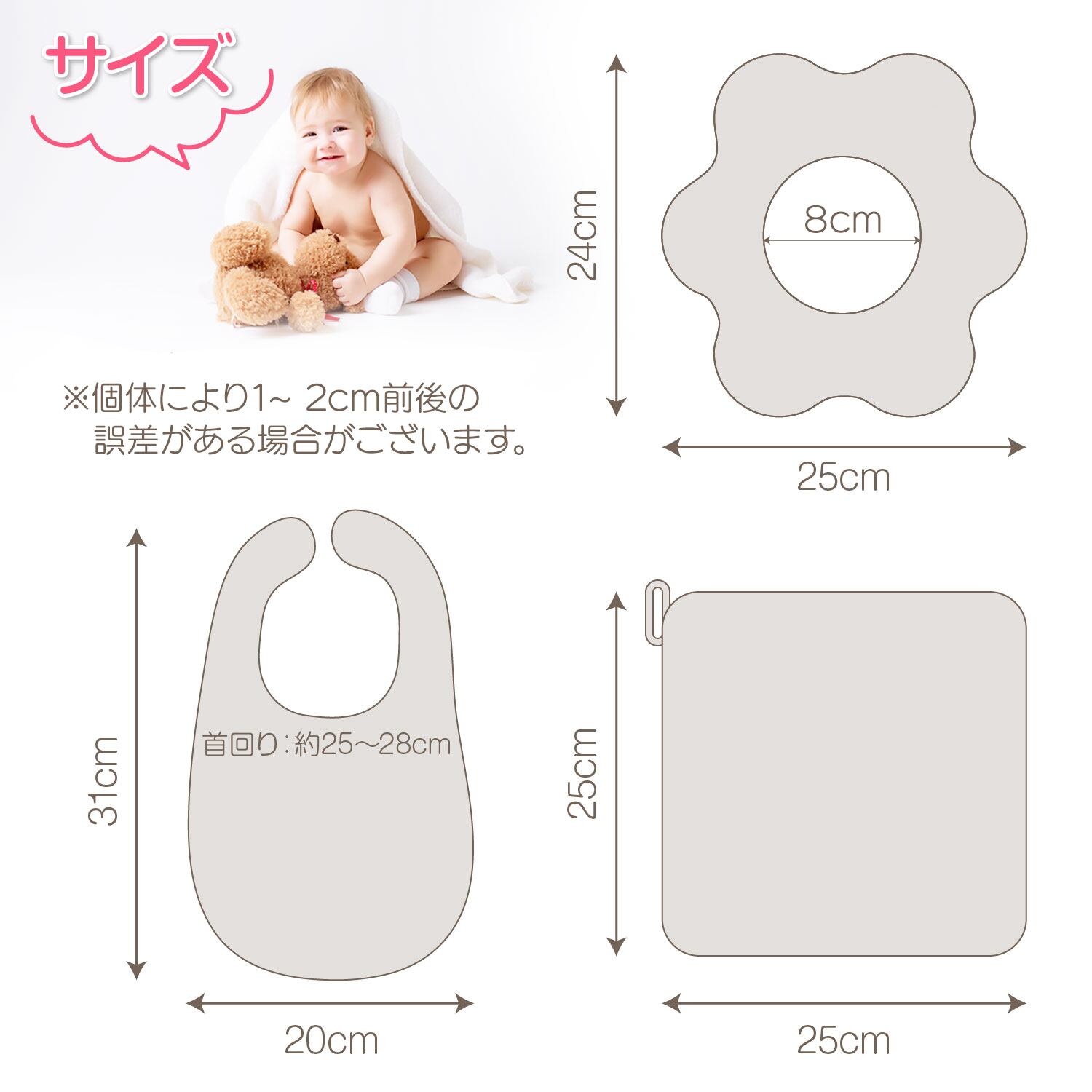 サイズ:25×24cm(360°スタイ)、20×31cm(U型スタイ)、25×25cm(ハンカチ)
