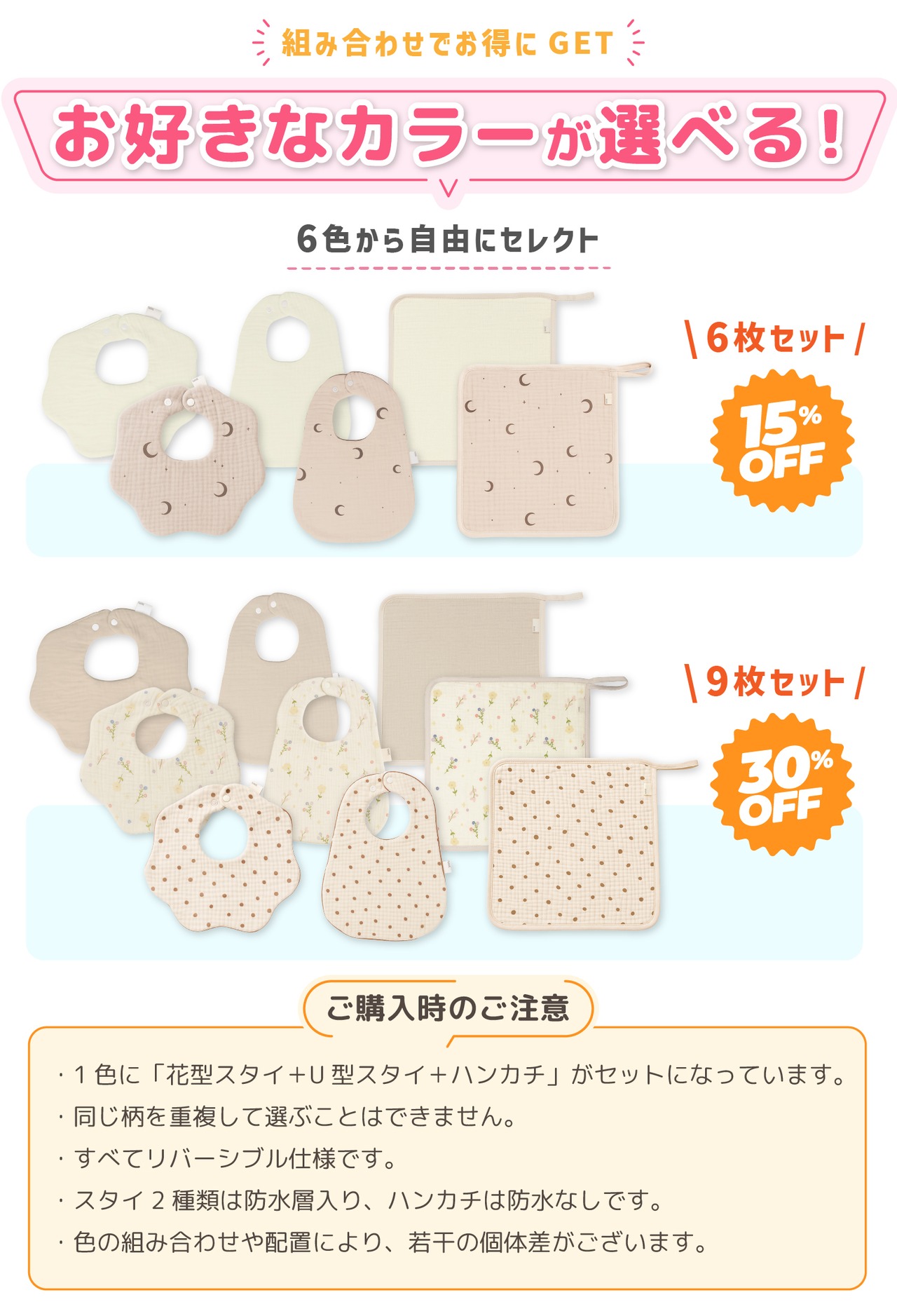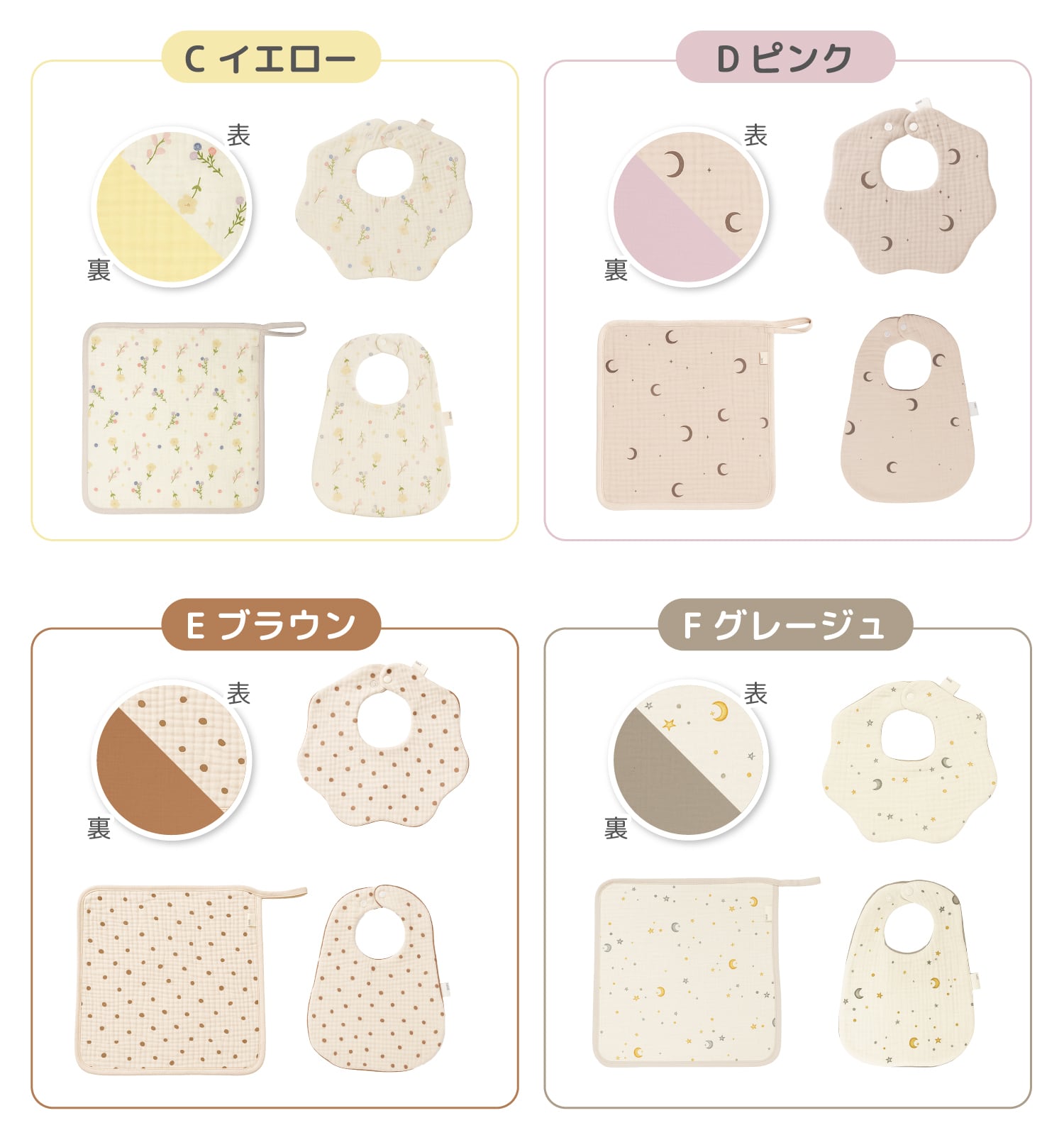 スタイ2種は7層仕立て、ハンカチは4層構造の綿100%ガーゼを採用。