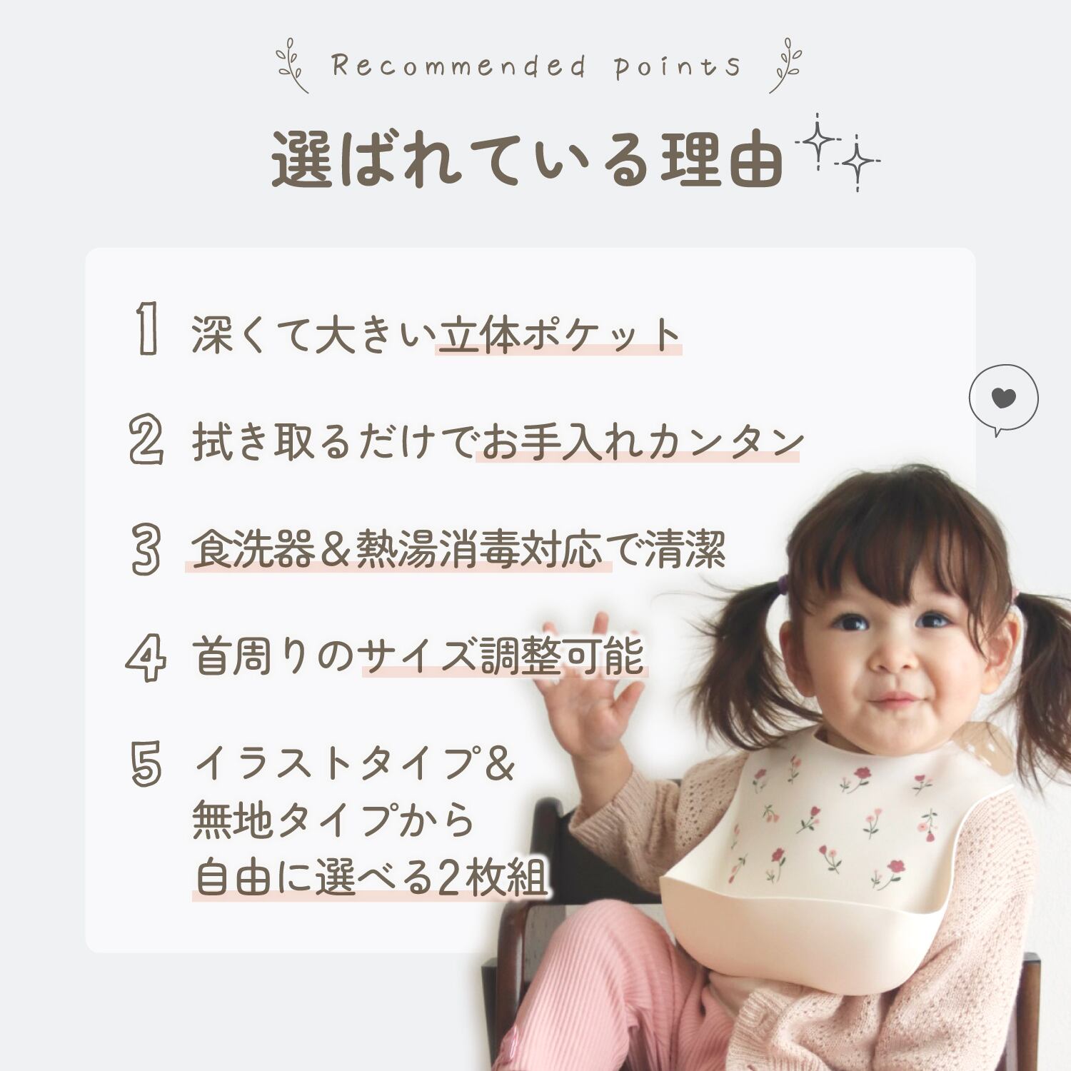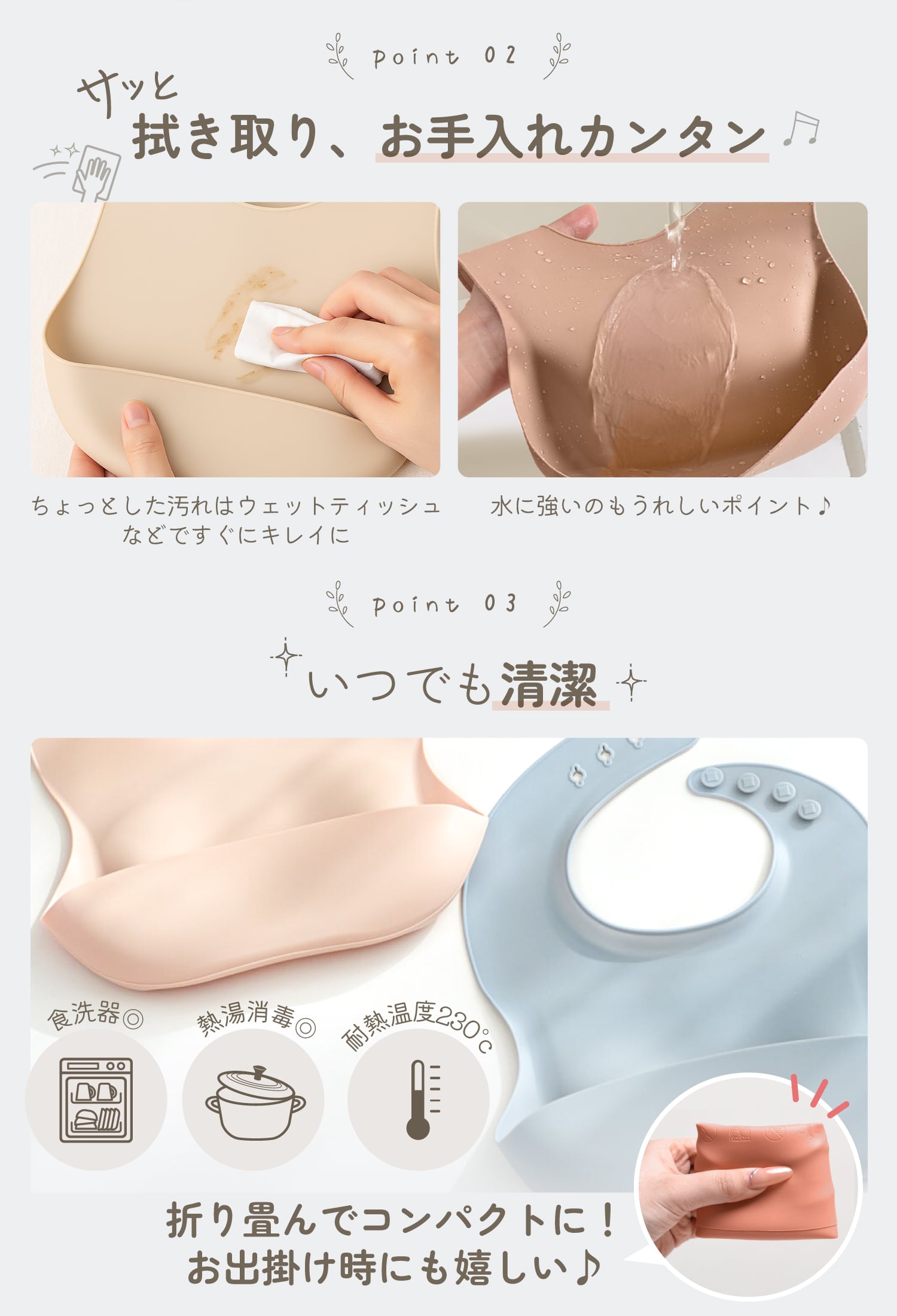 毎日のご飯やおやつの時間に便利な食事用のシリコンビブ。離乳食を始めたばかりの乳幼児をはじめ、手づかみ食べができるようになってきたお子様の、食事中の食べこぼしをしっかりキャッチします。