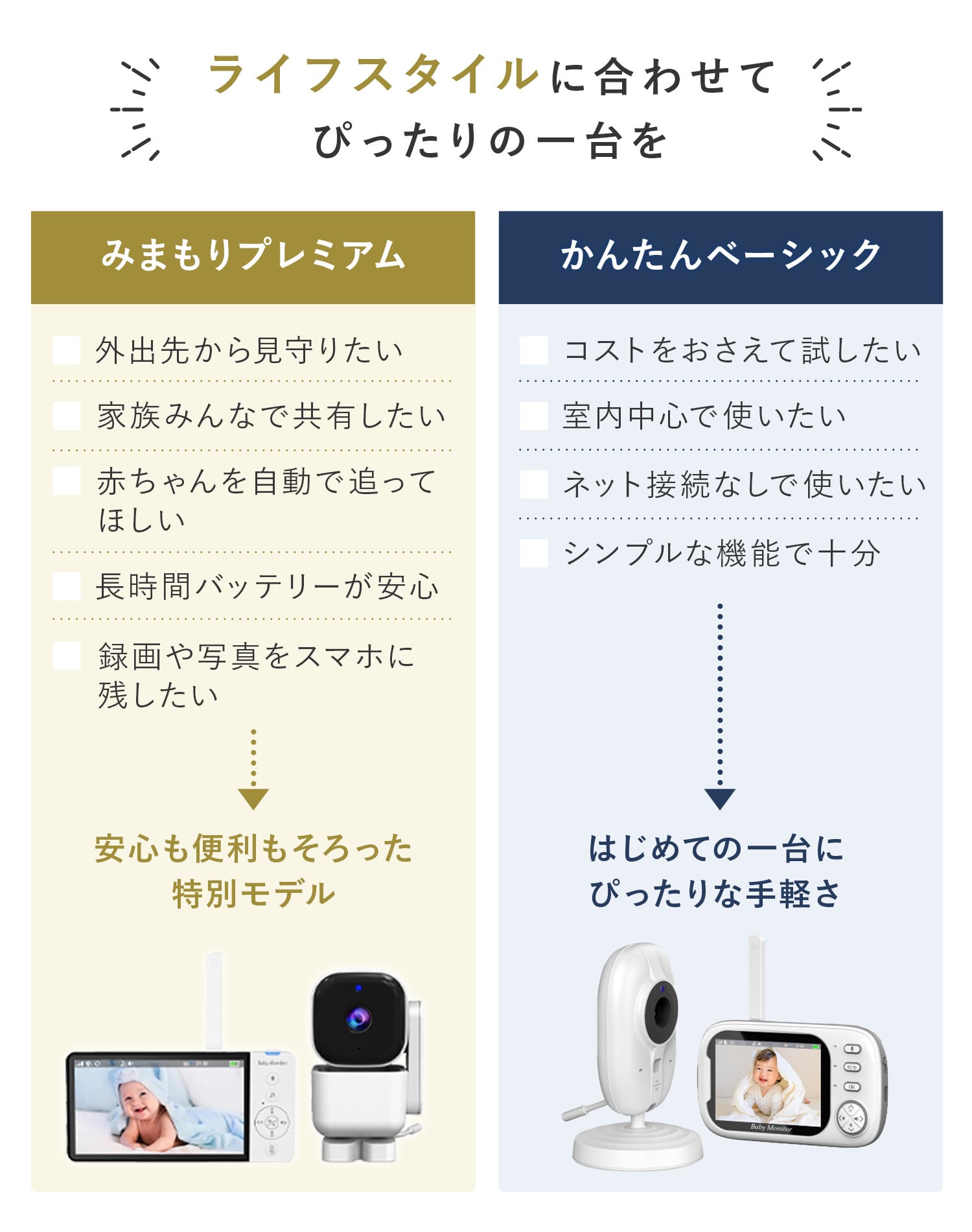 お家でも外出先でも使える「みまもりプレミアム」と、シンプルで使いやすい「かんたんベーシック」の2種類をご用意。