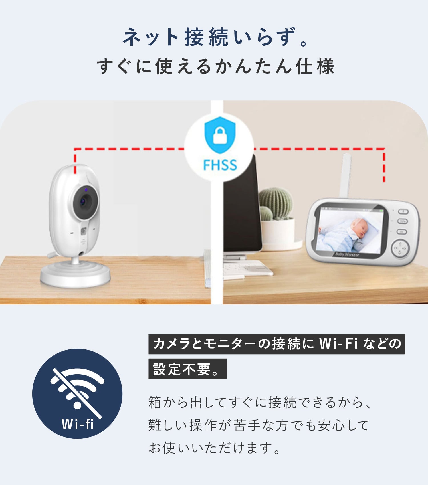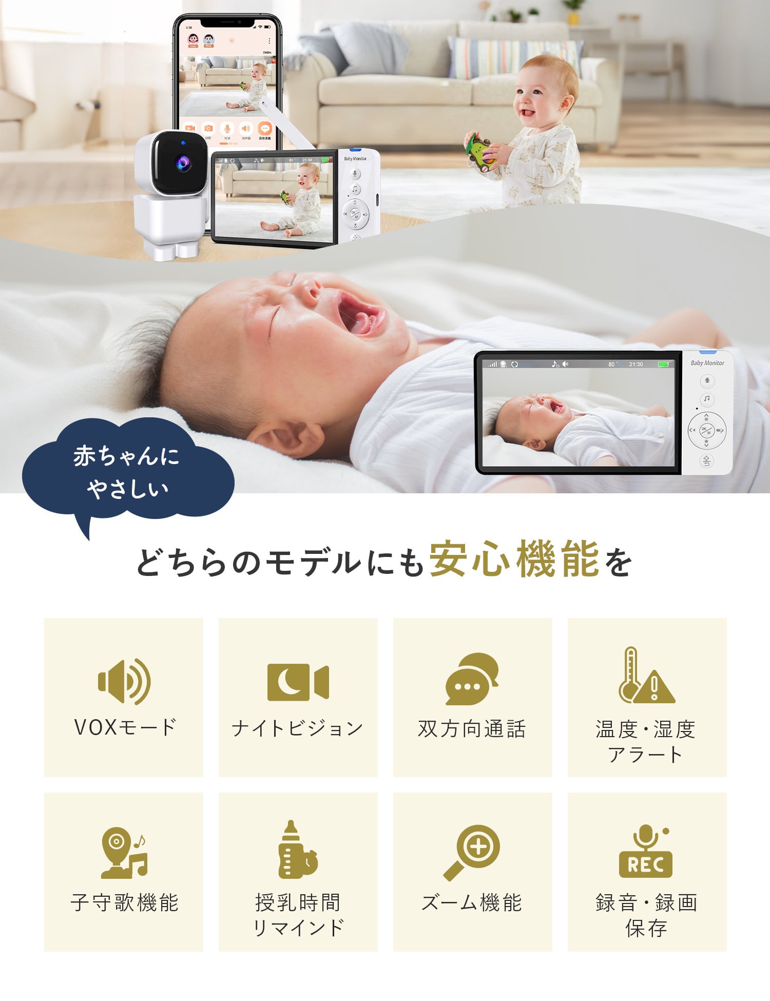 VOXモード、ナイトビジョン、双方向通話、温度・湿度アラート、子守歌機能、授乳時間リマインド、ズーム機能、録音・録画保存など、多機能で安心。