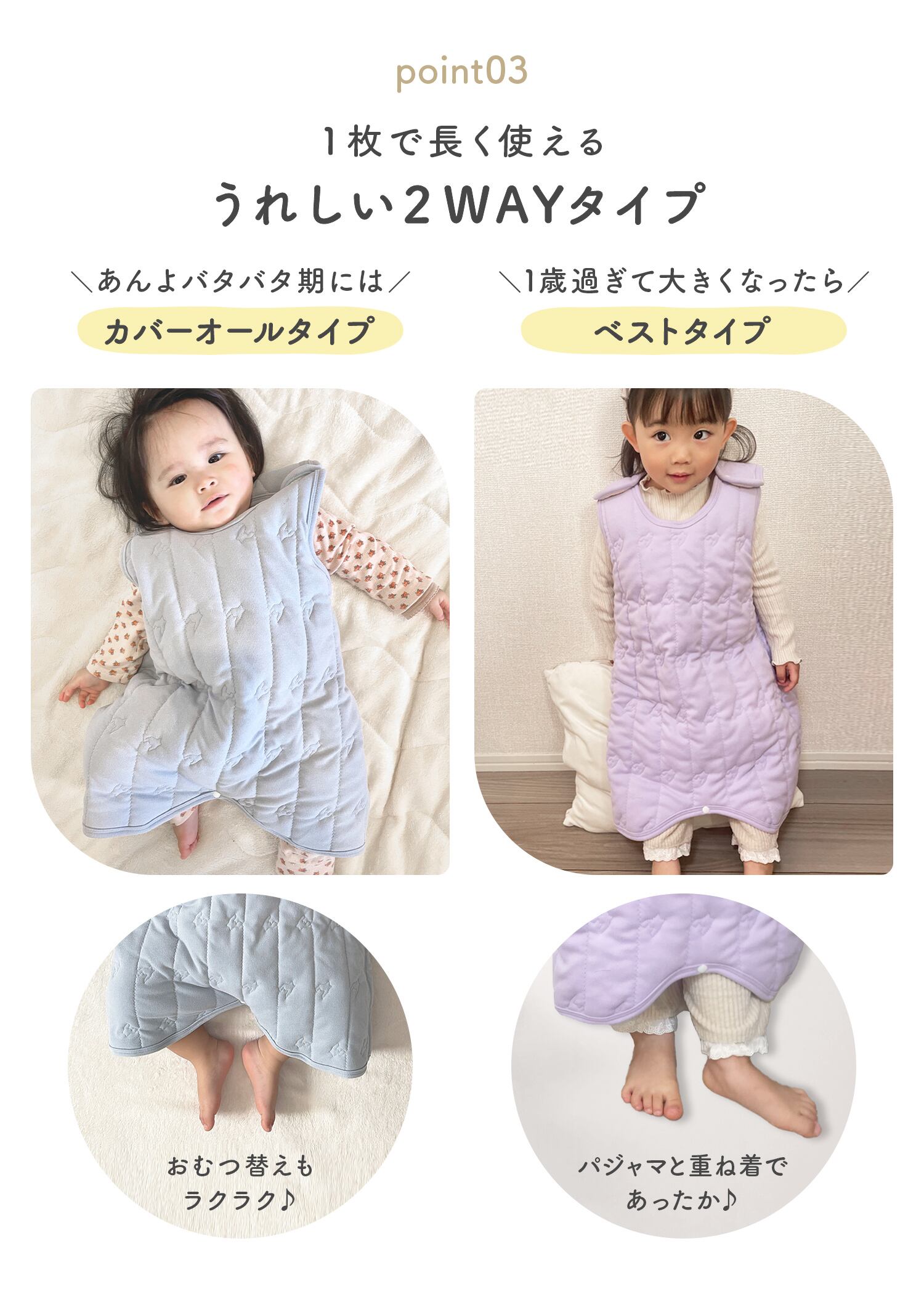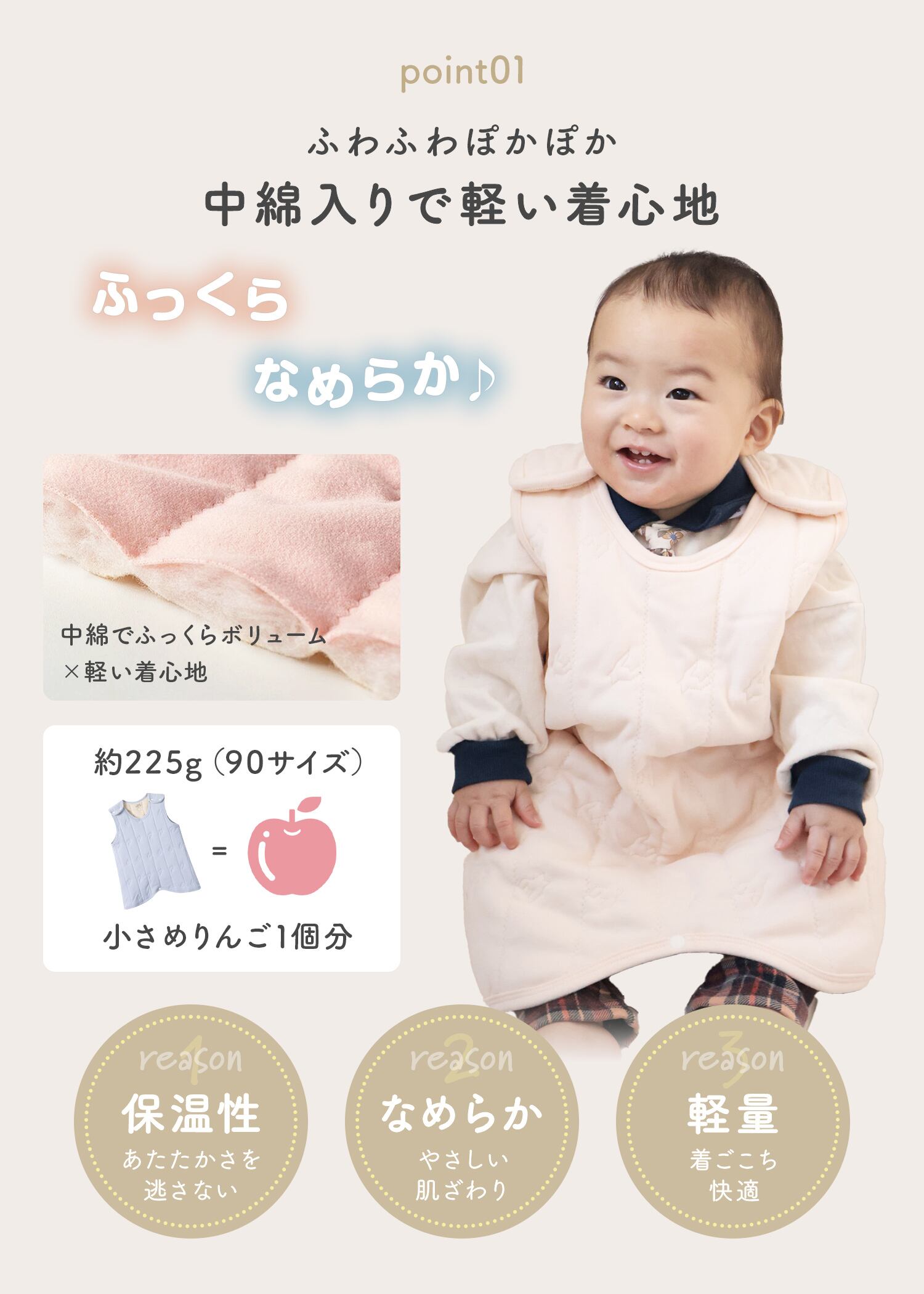 ・【ベストタイプ】 1歳を過ぎて大きくなったらベストとして。パジャマとの重ね着で、寒い夜もぽかぽか。