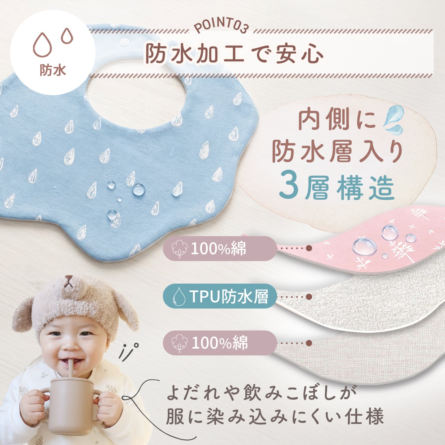 よだれや飲みこぼしが多い時期に活躍する、防水加工入りのスタイ。内側に防水層を挟んだ3層構造で、衣類への染み込みを軽減します。洗い替えに便利な複数枚セットで、忙しい毎日の育児をサポートします。