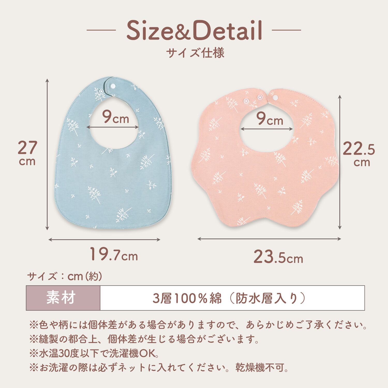 使い勝手の良い定番U型と、見た目が可愛らしい花型の2タイプをご用意。よだれ量やコーディネート、シーンに合わせて選べます。その日の服装に合わせやすい、やさしいカラー展開も魅力です。