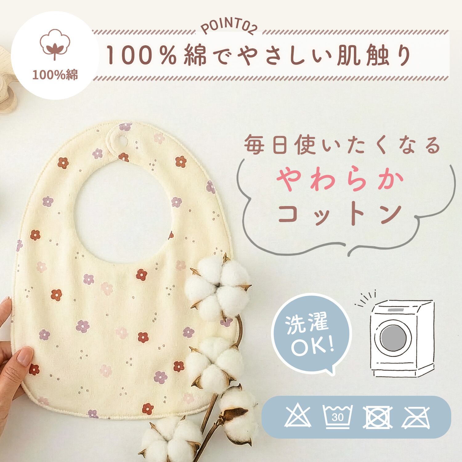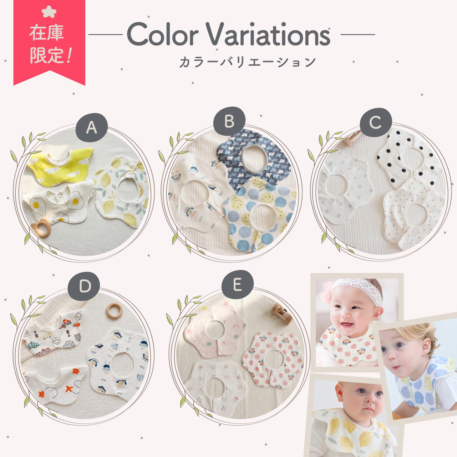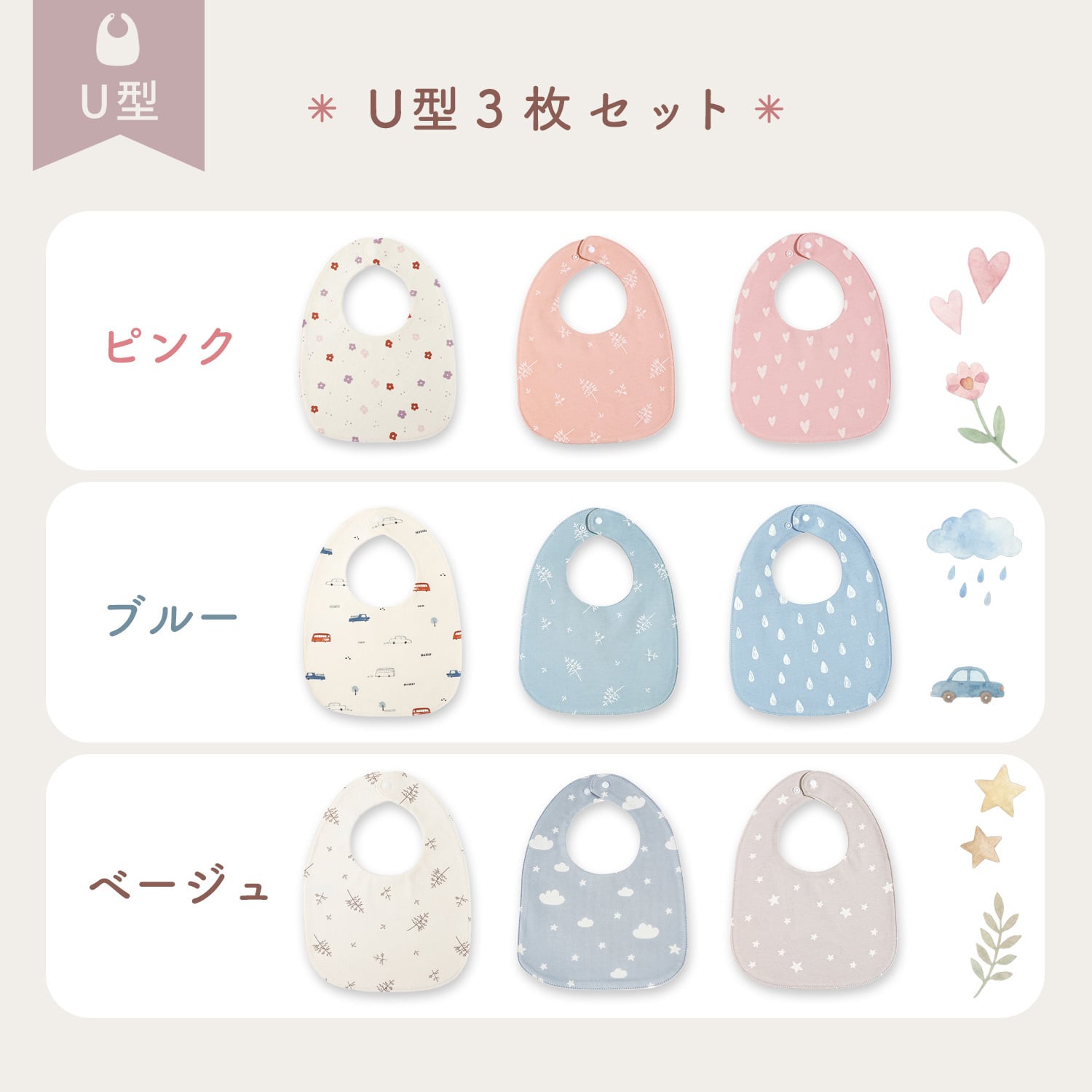 使い勝手の良い定番U型と、見た目が可愛らしい花型の2タイプをご用意。よだれ量やコーディネート、シーンに合わせて選べます。その日の服装に合わせやすい、やさしいカラー展開も魅力です。