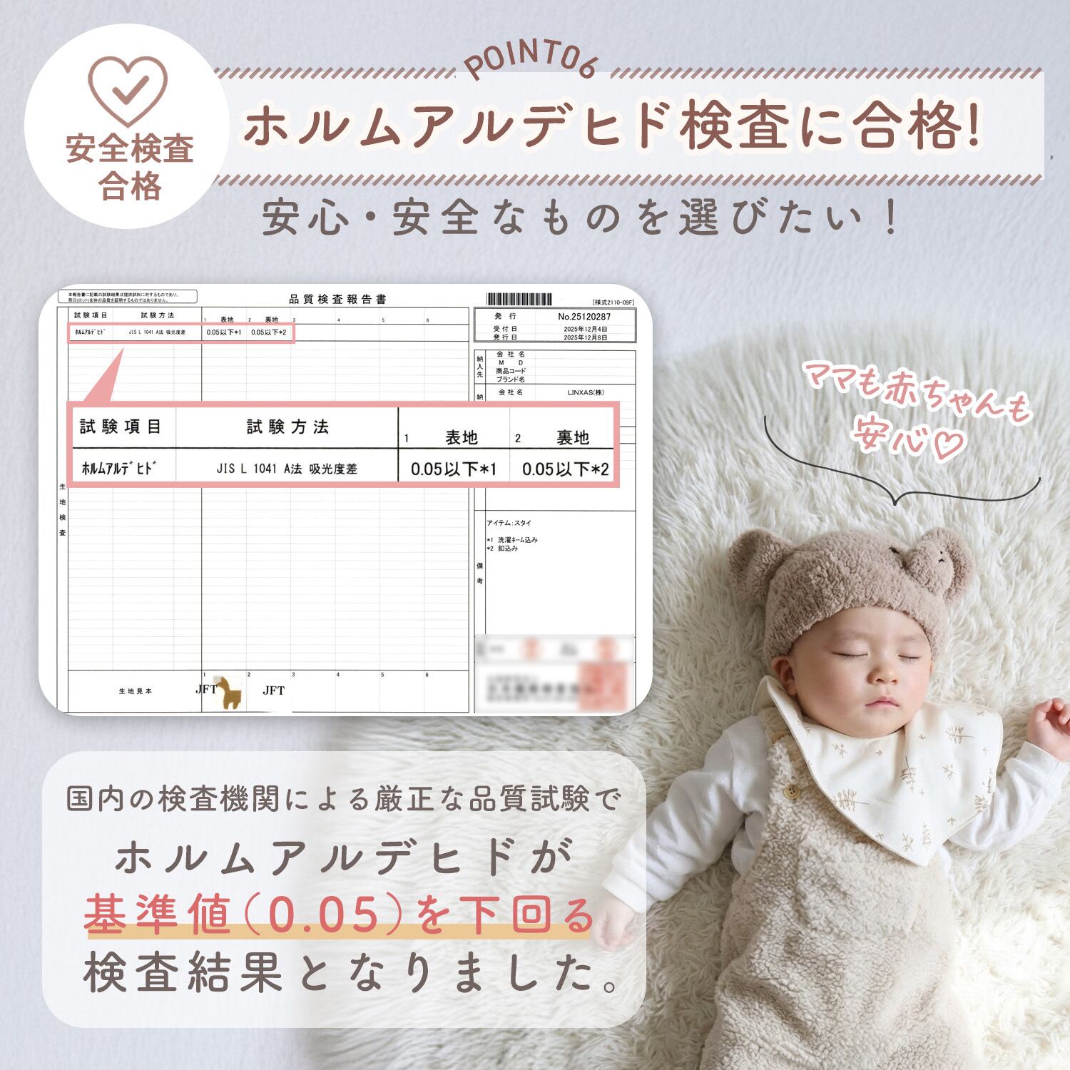 首回りは2段階スナップ仕様で、月齢や体格に合わせて微調整が可能。ズレにくくフィットしやすいため、動きが増えてきた時期にも使いやすい設計です。
