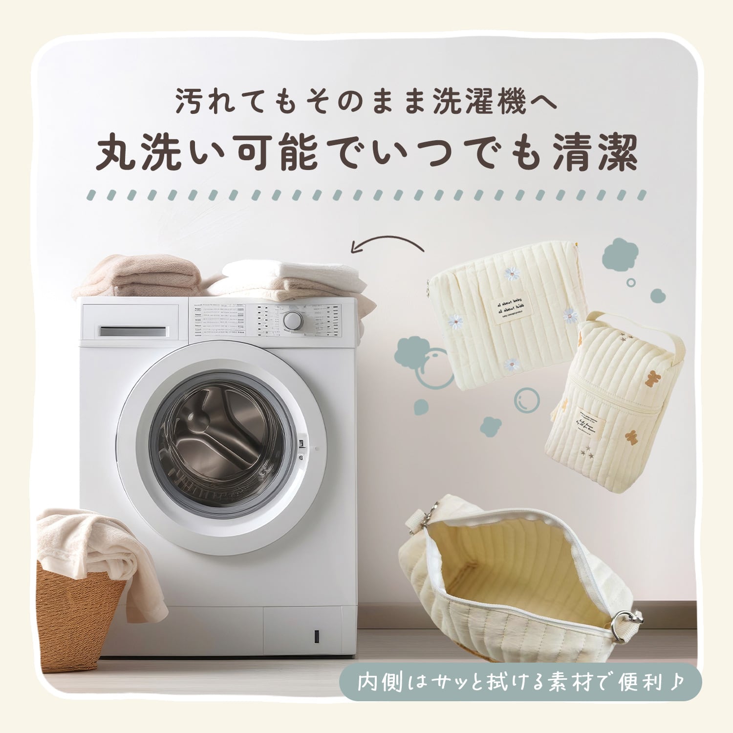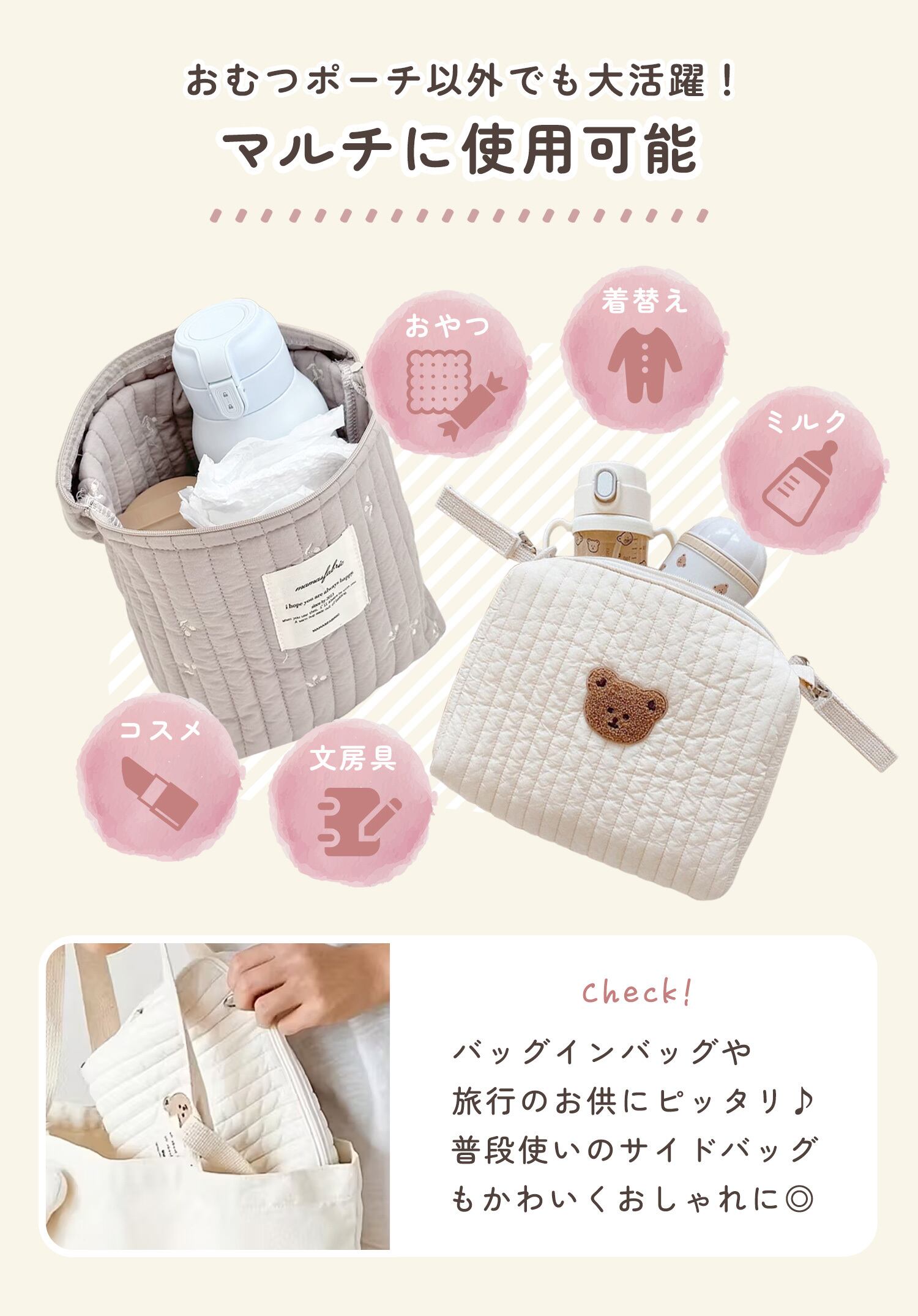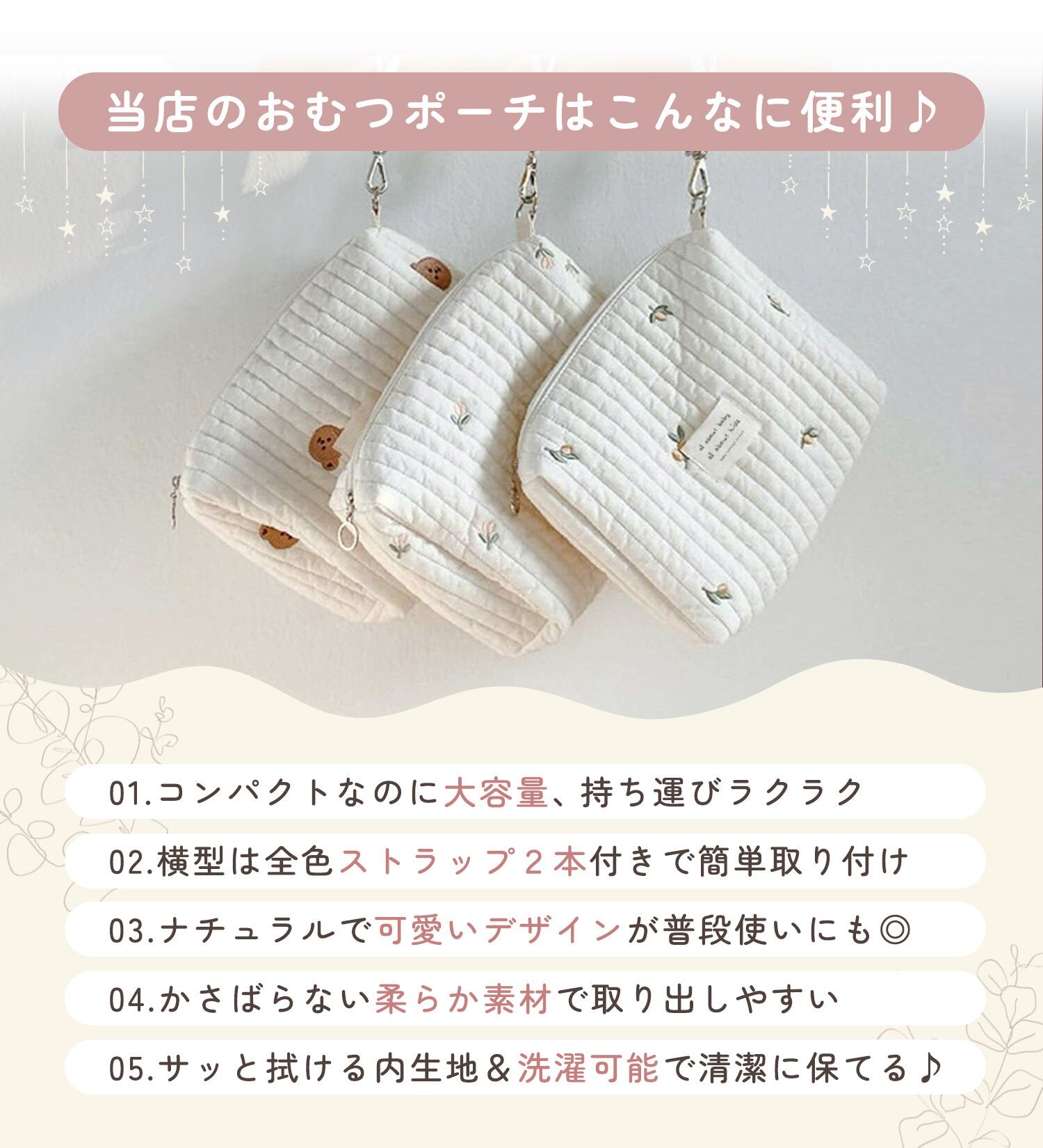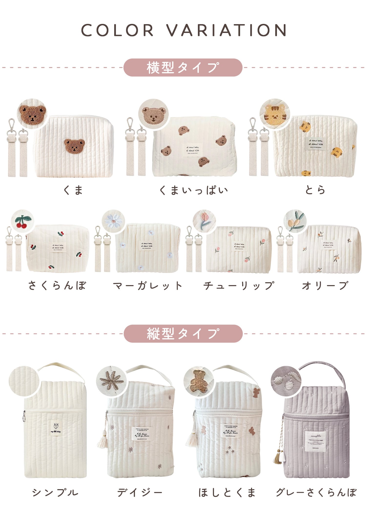 かさばるベビー用品を持ち歩くのにピッタリな、マチの広い大容量ポーチ。