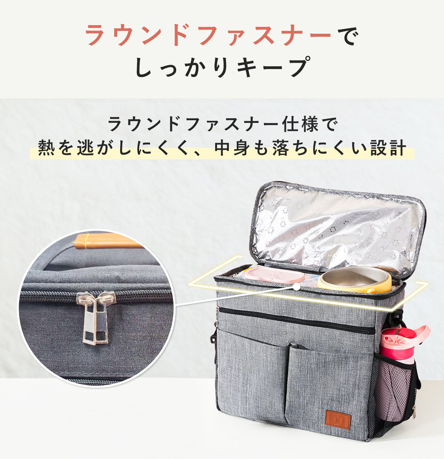 しっかり閉まるラウンドファスナーは、見た目をスッキリ見せるだけでなく、保冷・保温機能もバッチリ。