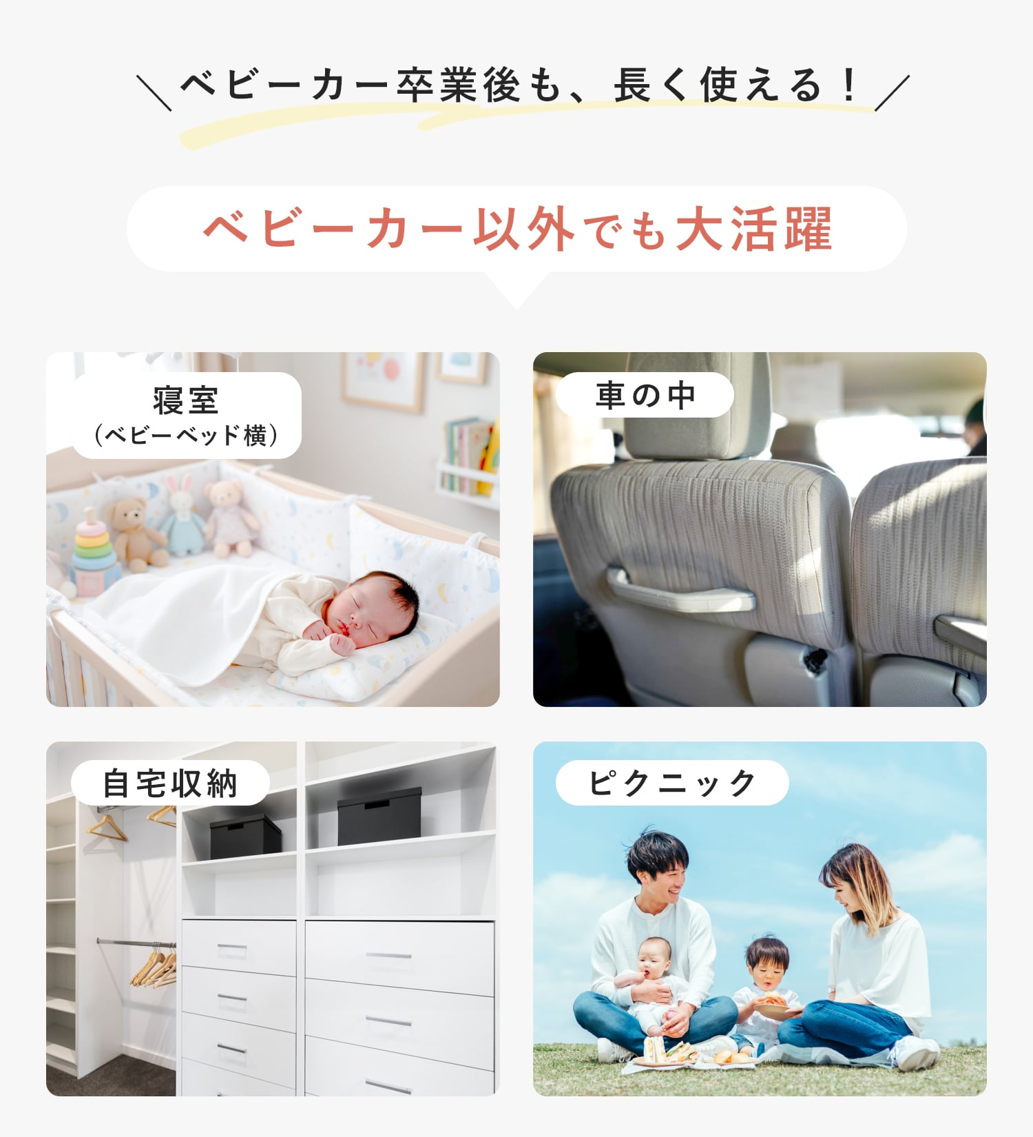 ベビーカーを使わない日や、お子様が成長した後も、長く愛用できるデザインです。
