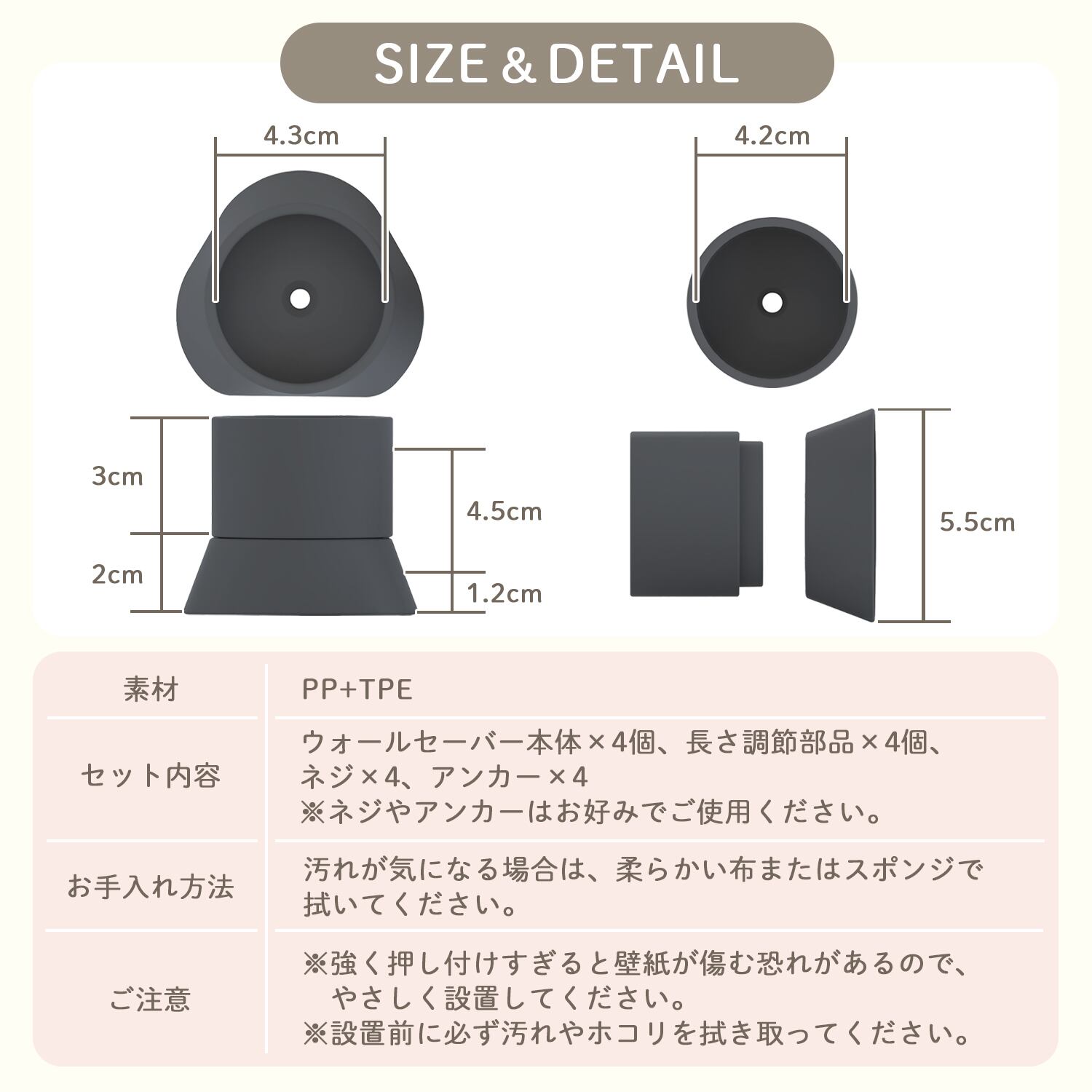 壁に触れるパットは直径6.2cm。パットに均一に圧力がかかることで、壁を傷つけずにしっかりと密着します。吸着力も高く安定性抜群で、大切なお子様やペットの怪我や事故などを防ぎます。