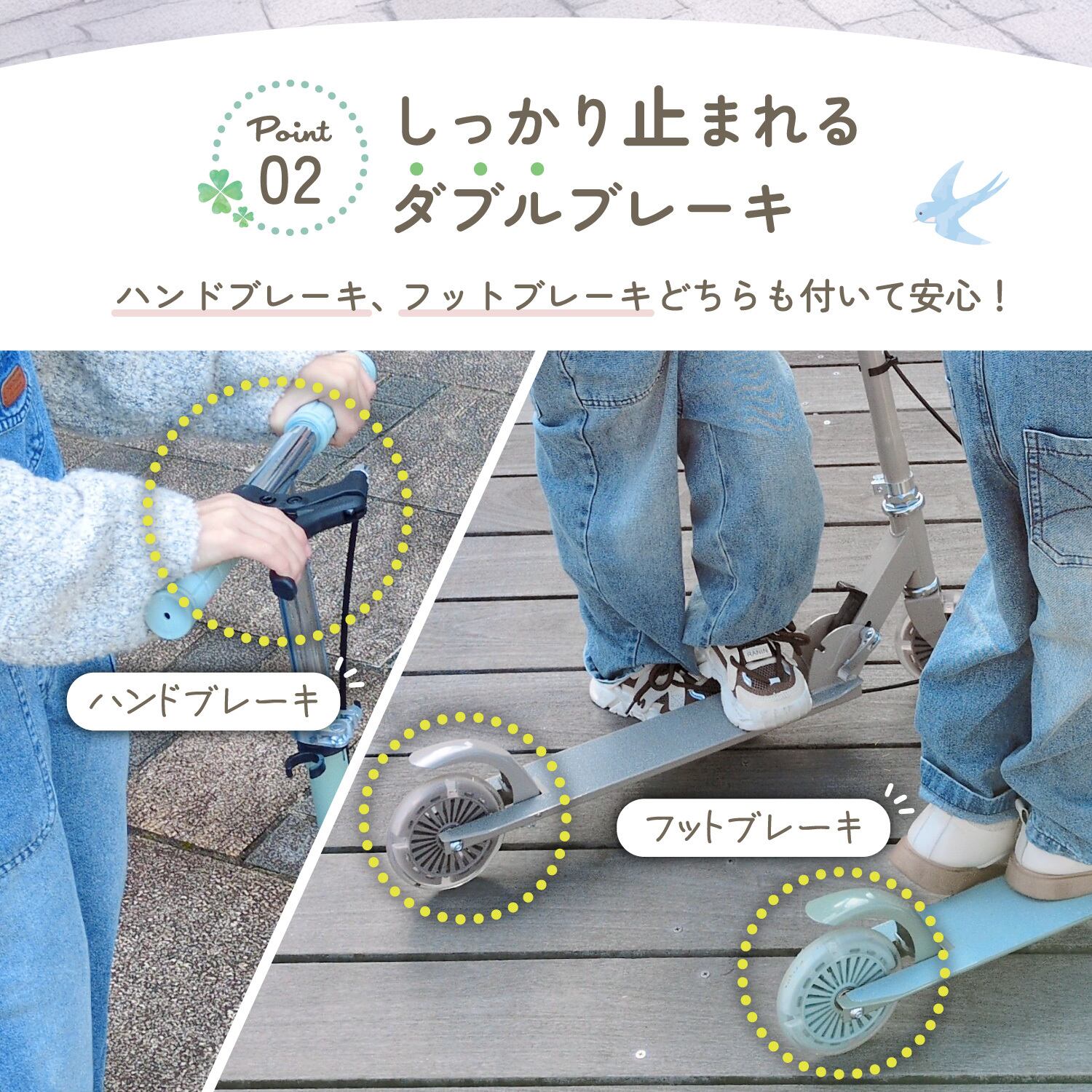 フットブレーキ付きで、しっかり減速。