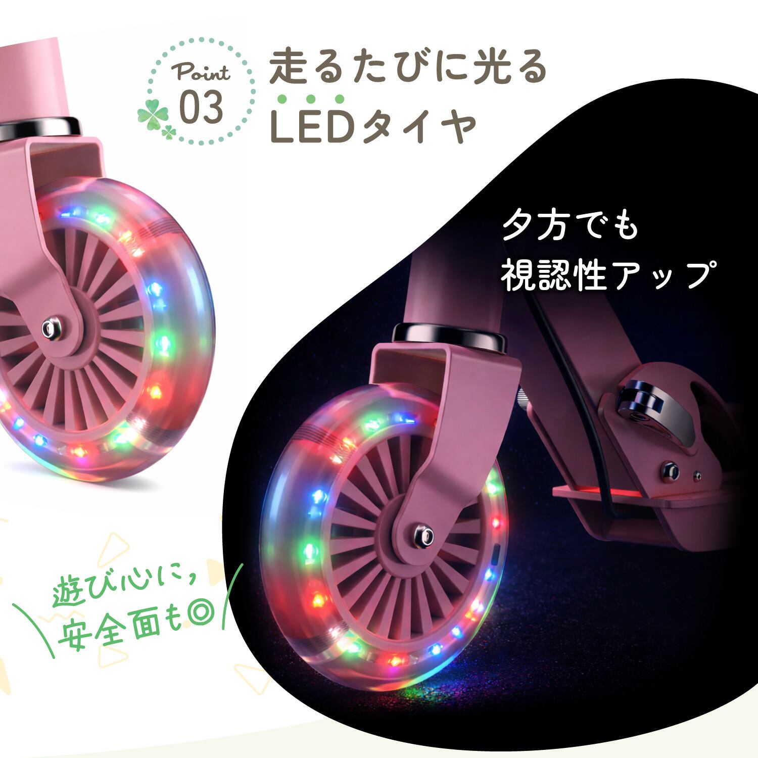 走行時に光るLEDライト付きで、存在感をプラス。