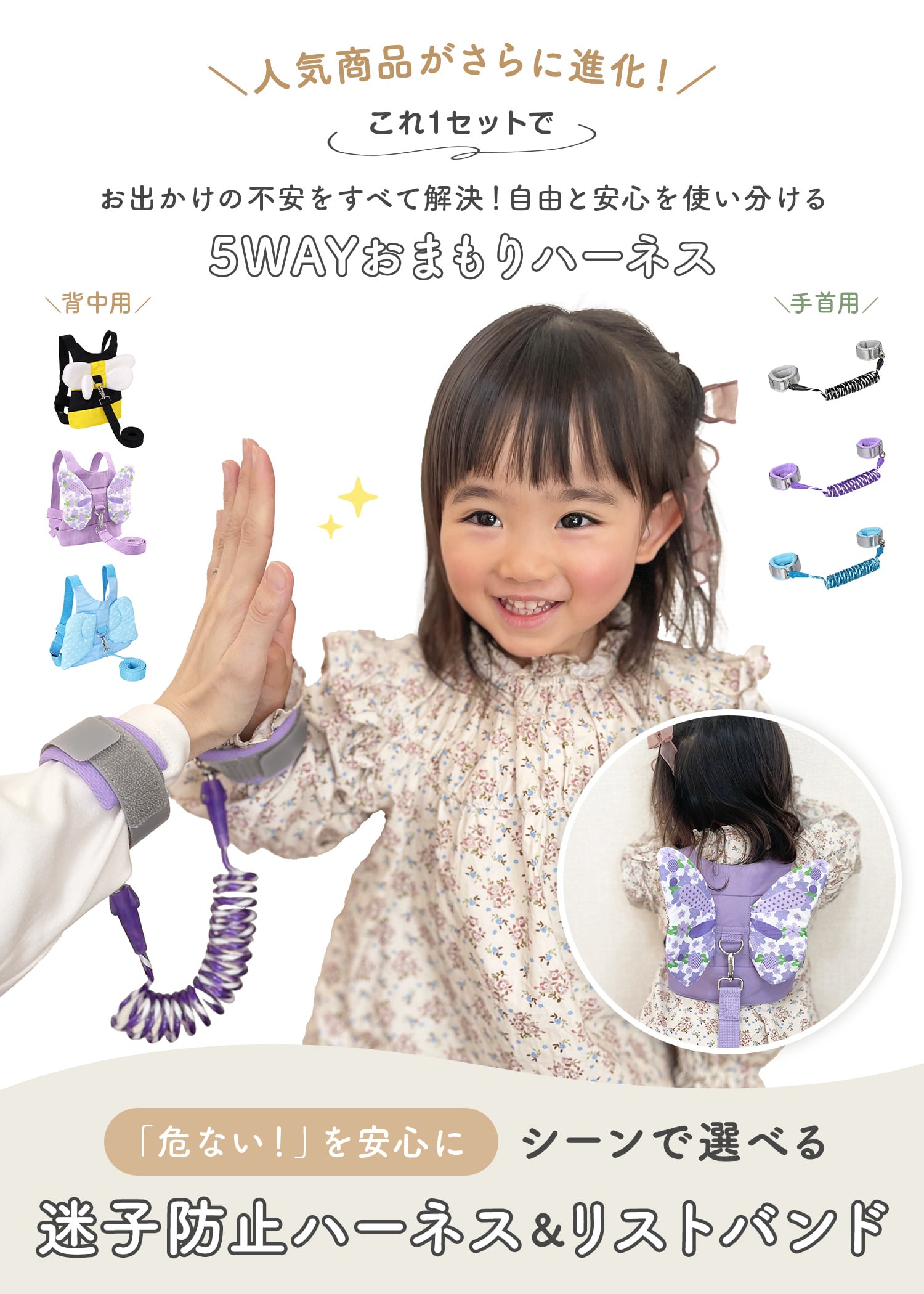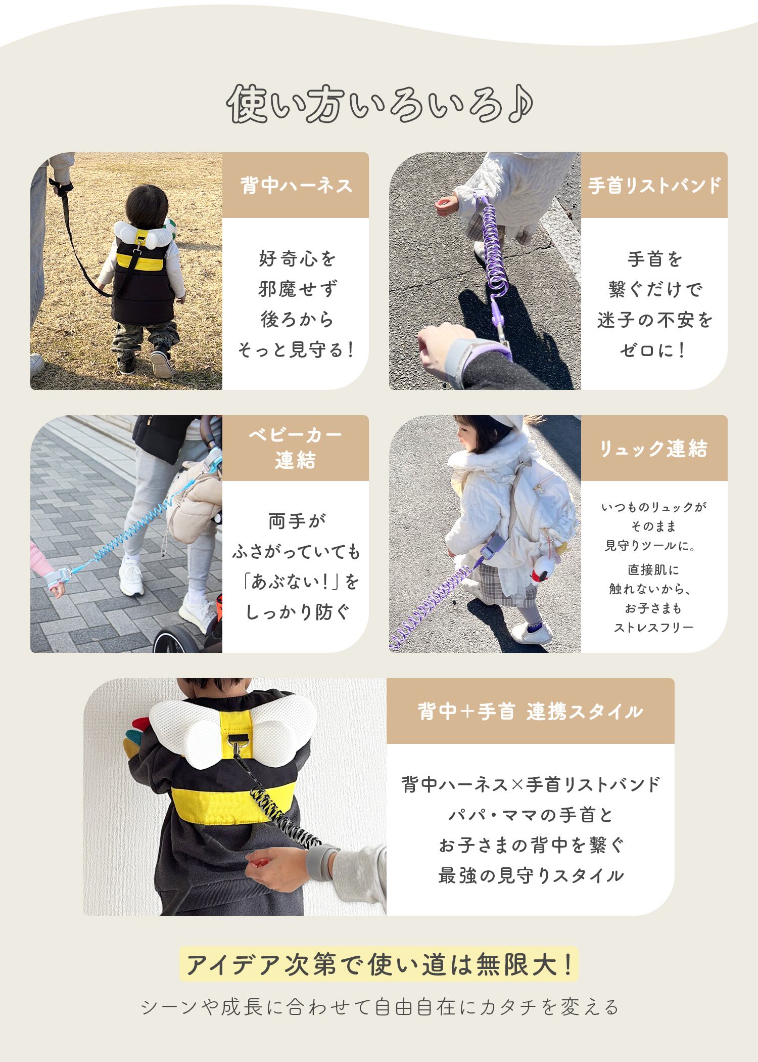 シーンや成長に合わせて「背中×手首」「手首×手首」「ベビーカー連結」など、自由自在な使い分けが可能です。