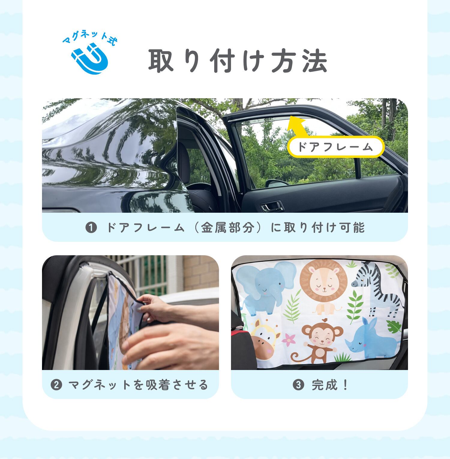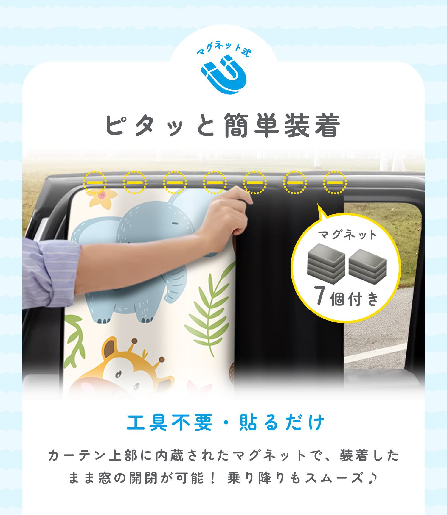 上部に内蔵されたマグネットがドアフレームの金属部分に吸着。工具不要で取り付けられ、装着したまま窓の開閉も可能です。乗り降りの動作も妨げにくい設計です。