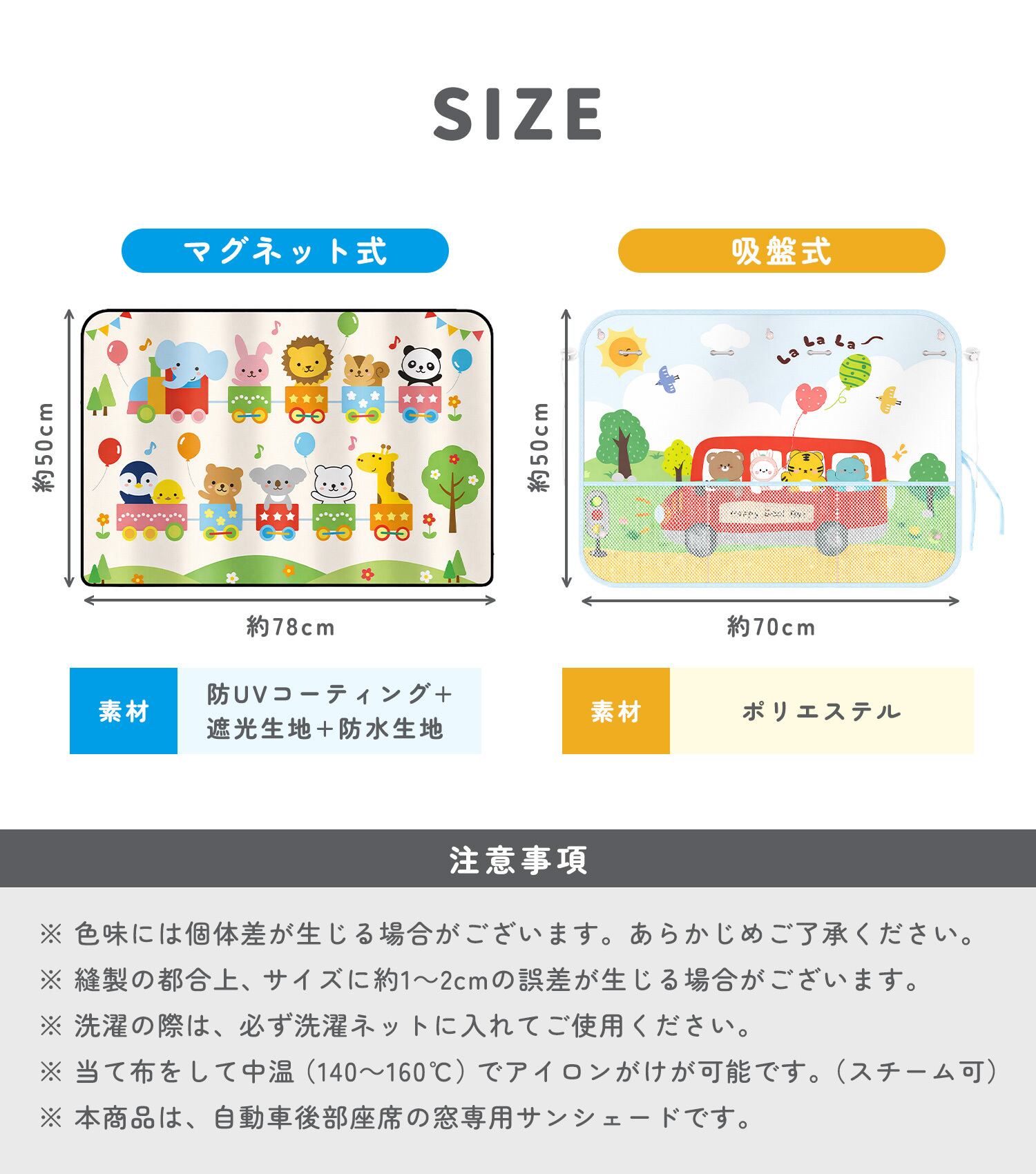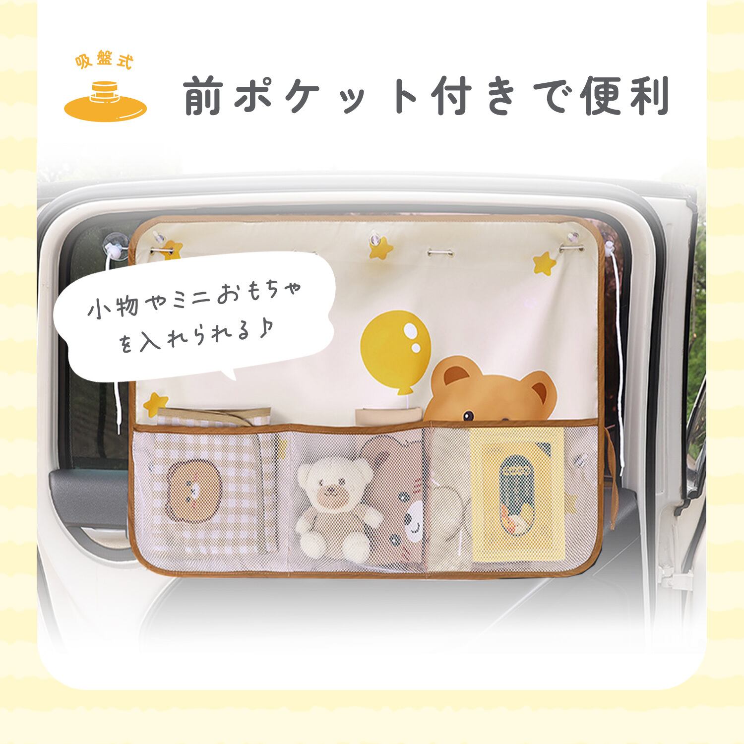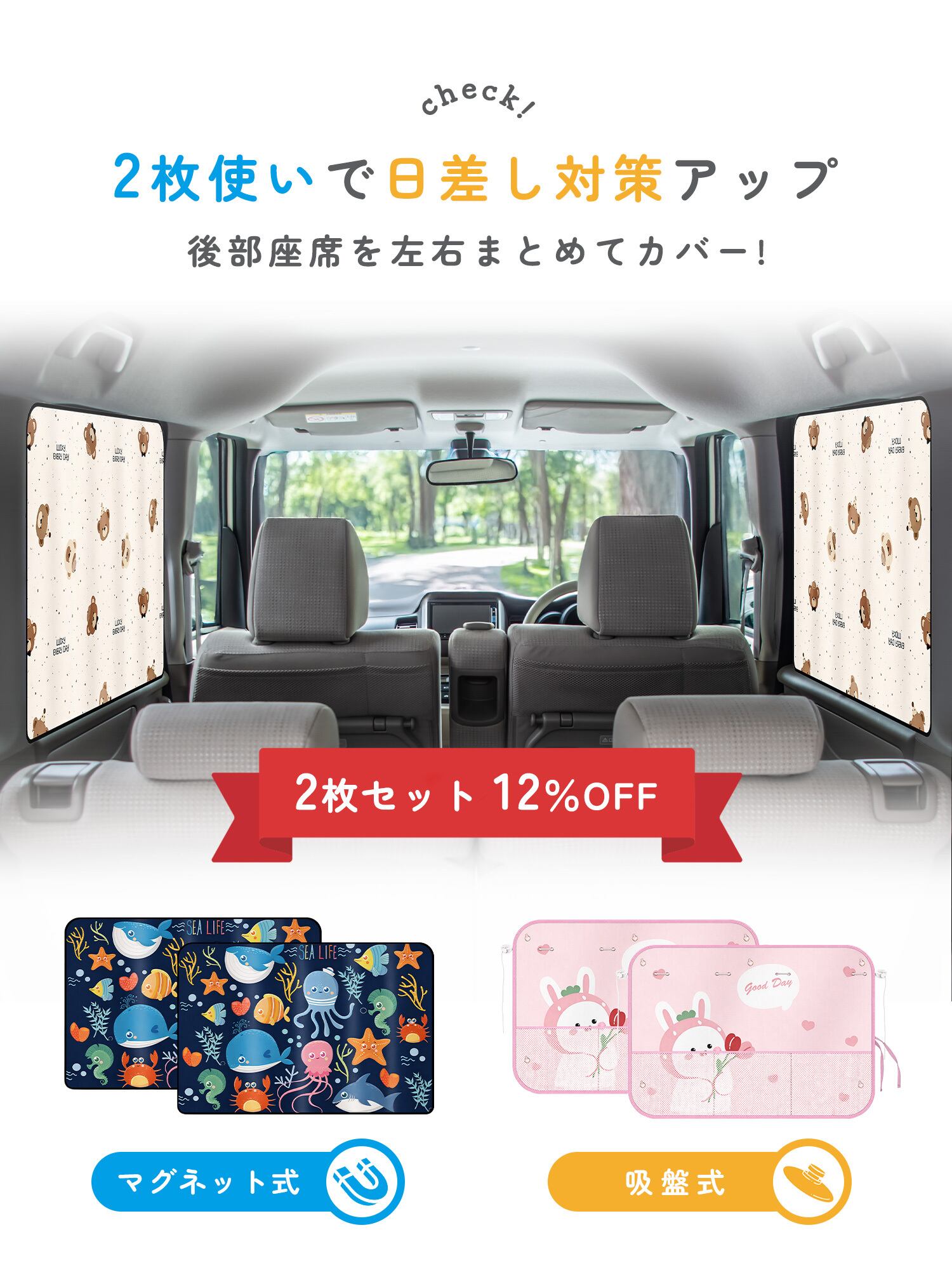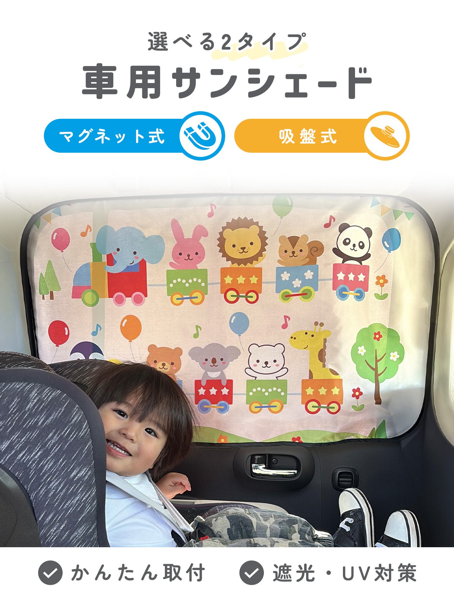 動物や海のなかまなど、やさしいイラストデザインを採用。車内を明るい印象にし、移動時間を楽しい空間に演出します。2枚使いで左右の窓をまとめてカバーすることも可能です。