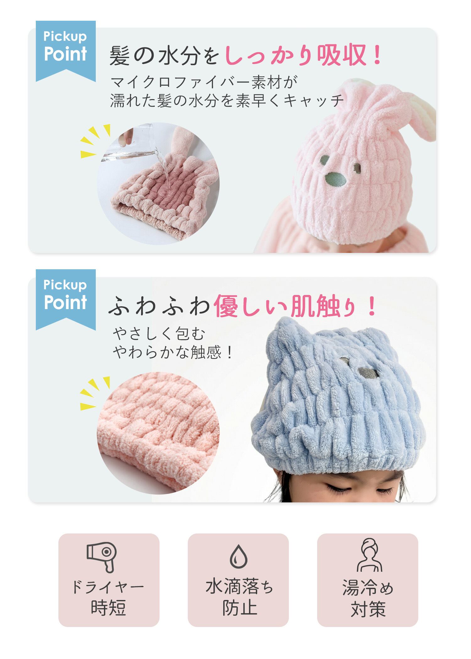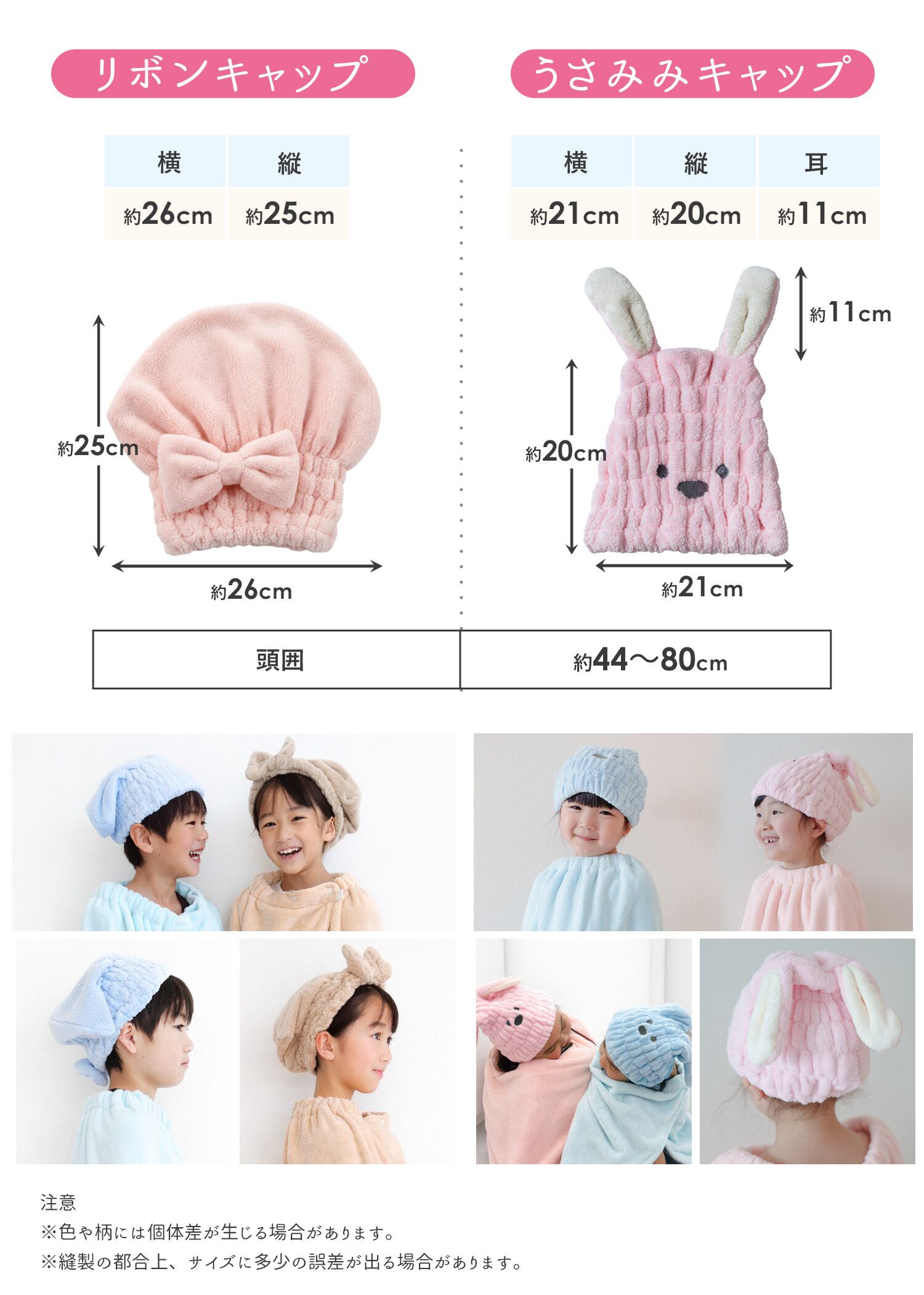 同素材の「タオルキャップ(うさみみ/ビッグリボン)」とのセット使いで、髪の水分も同時にケア。