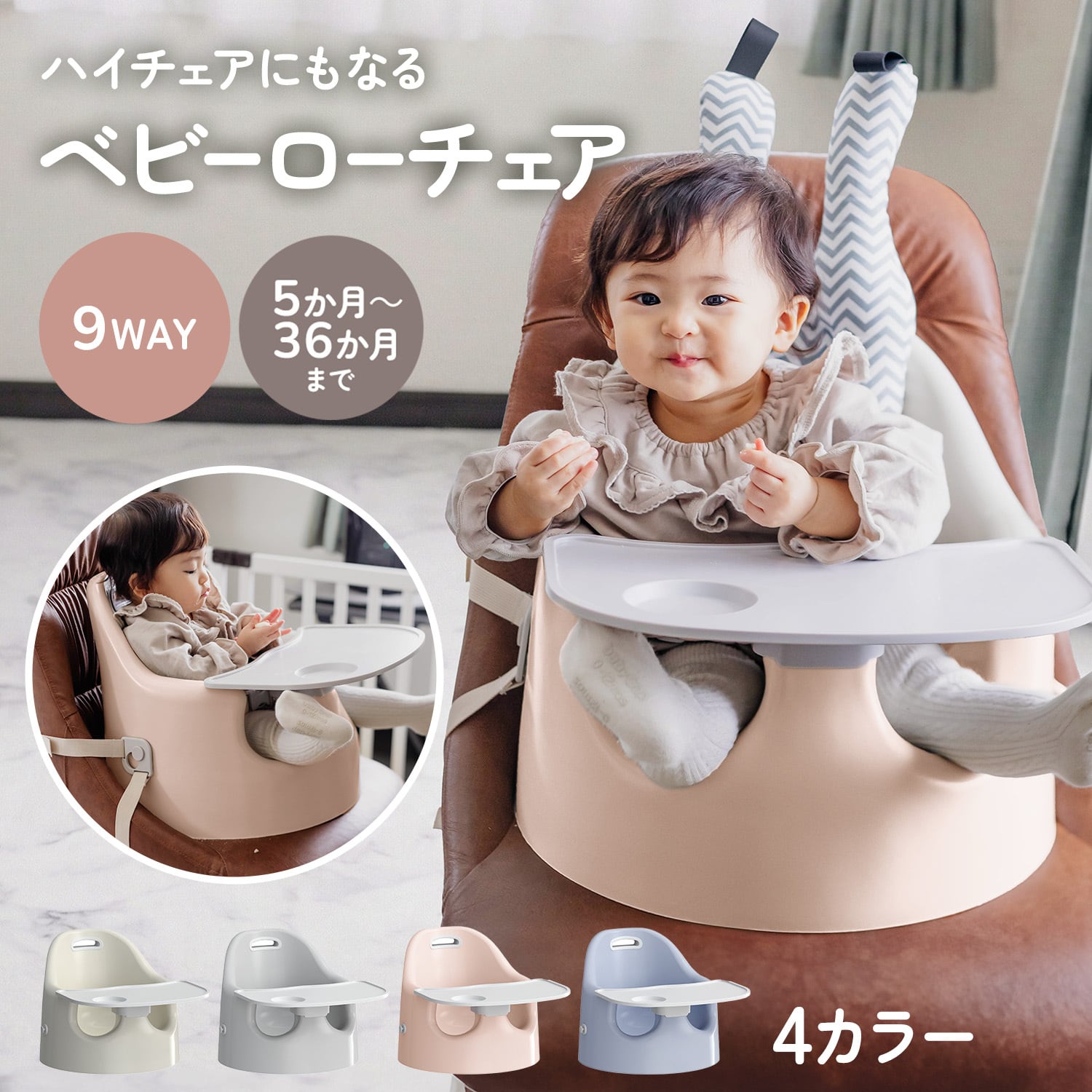床置きで使えるローチェアとしてはもちろん、大人用チェアに取り付けてハイチェアとしても使用できる2WAY仕様。生活スタイルや食事シーンに合わせて使い分けができます。成長に合わせて使えるため、長く活躍するベビーチェアです。