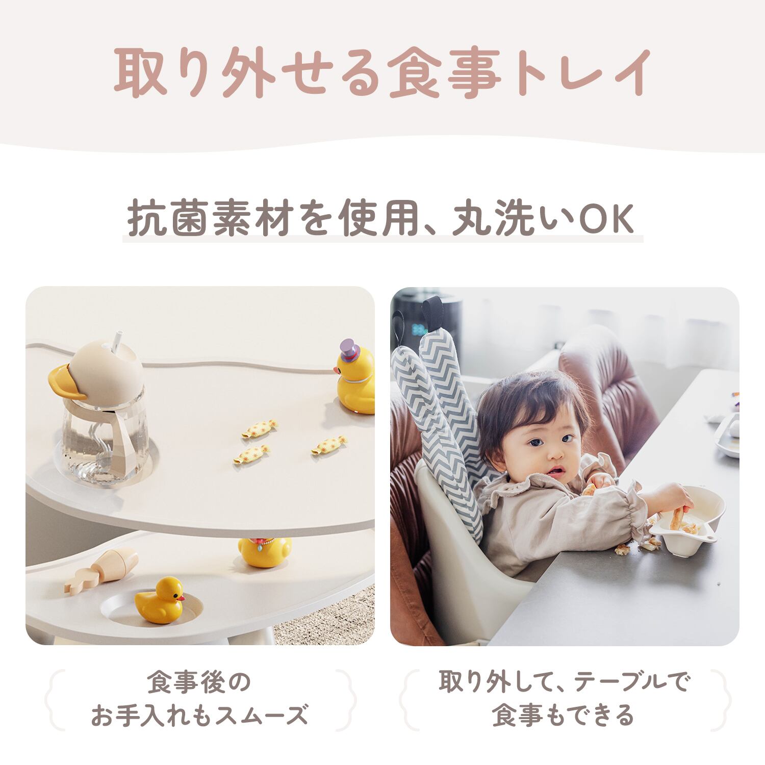 食事用トレイは簡単に取り外しが可能。食後は丸洗いできるので、離乳食期でもお手入れがしやすい設計です。トレイを外せばテーブルに近づけて座れるため、大人と同じ食卓で食事を楽しむことができます。