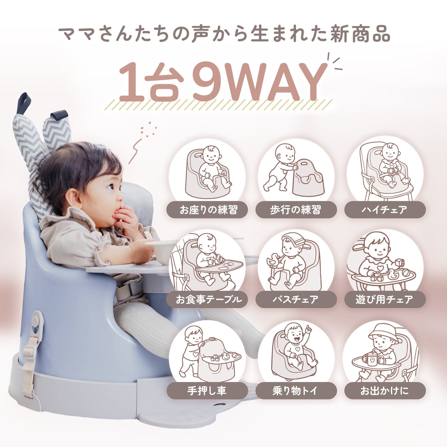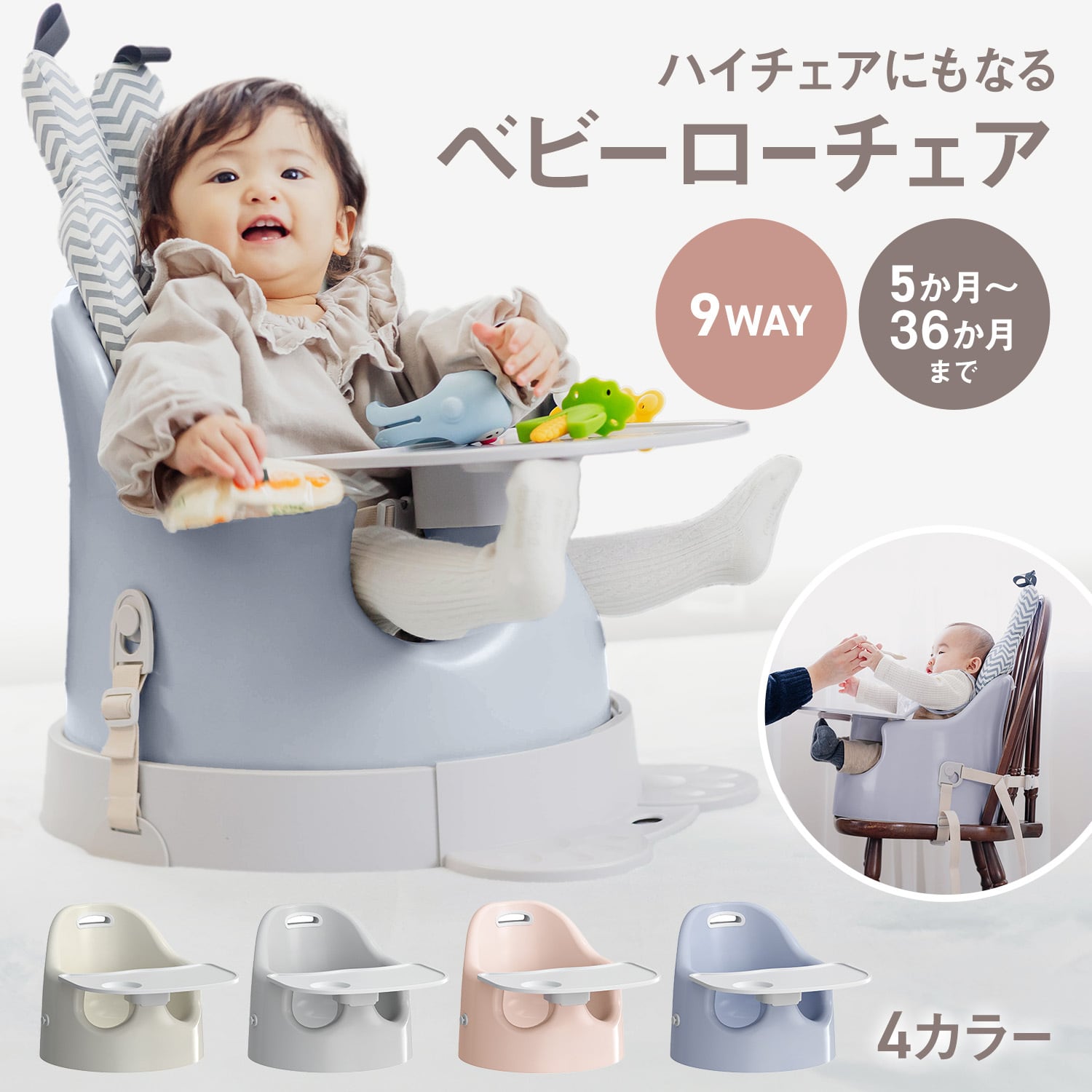 床置きで使えるローチェアとしてはもちろん、大人用チェアに取り付けてハイチェアとしても使用できる2WAY仕様。生活スタイルや食事シーンに合わせて使い分けができます。成長に合わせて使えるため、長く活躍するベビーチェアです。