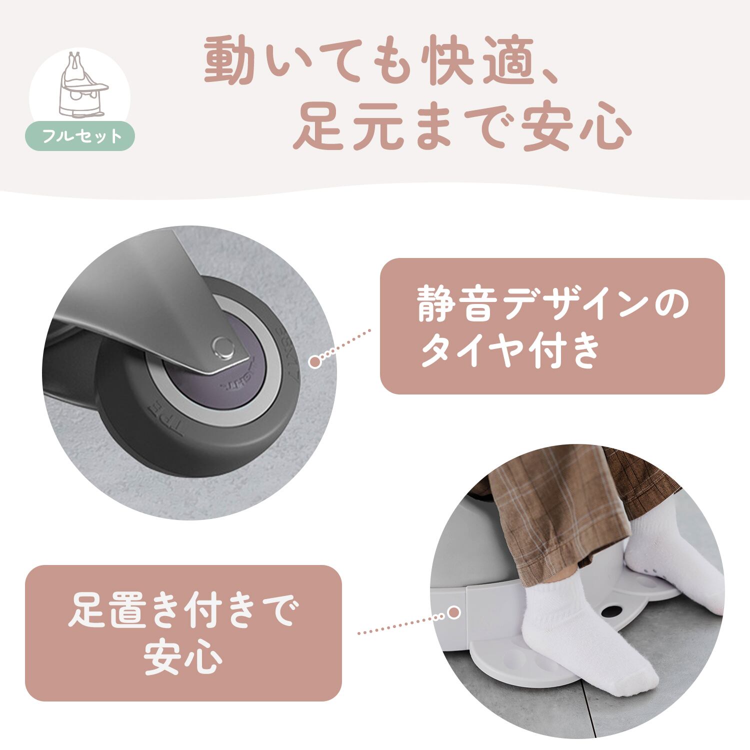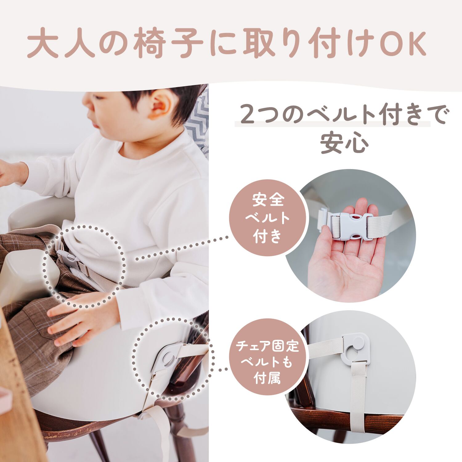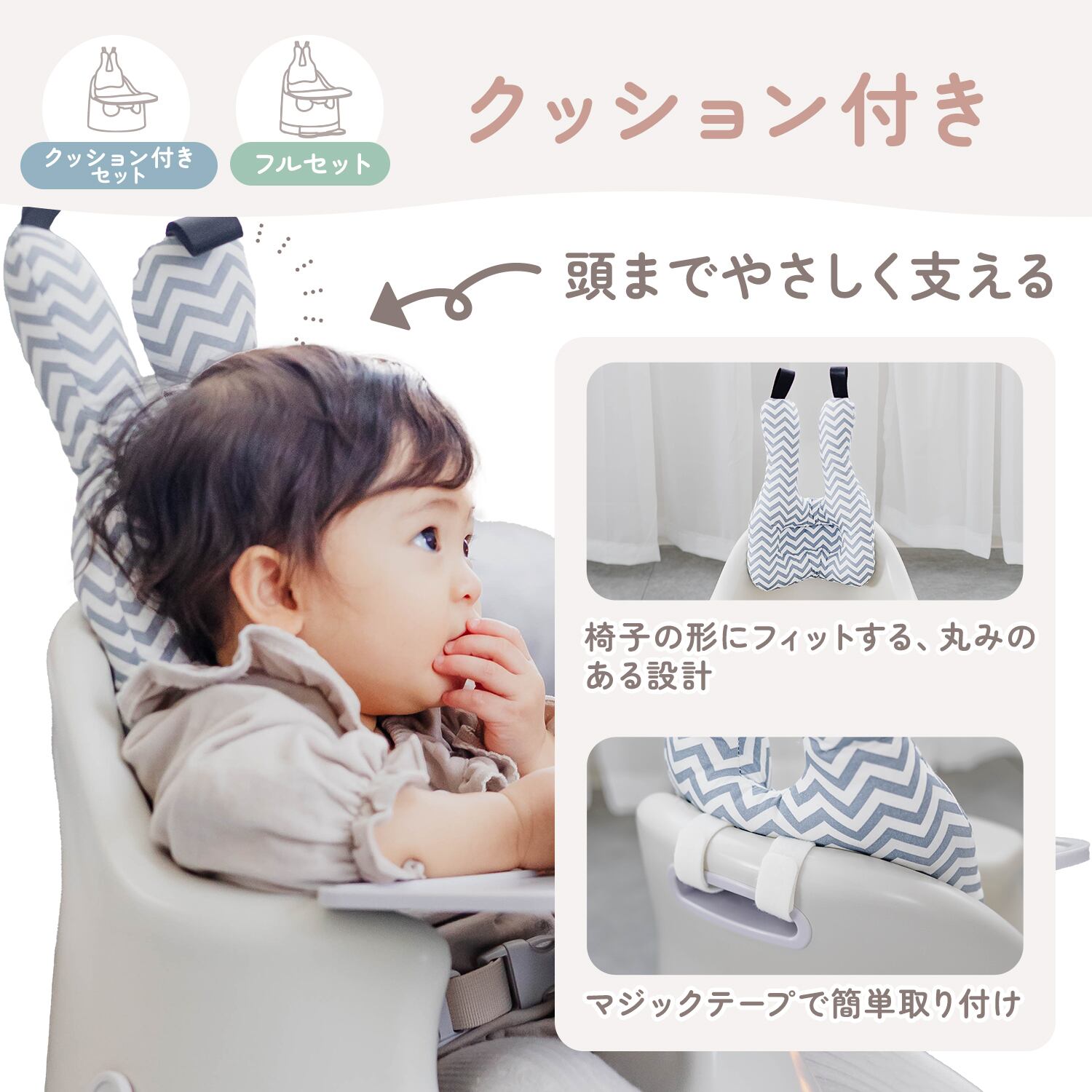 クッション付きセットは、頭までやさしく支える設計。丸みのある形状で椅子にフィットし、赤ちゃんの体をやさしく包み込みます。マジックテープで簡単に取り付けできるため、必要に応じて手軽に使えます。