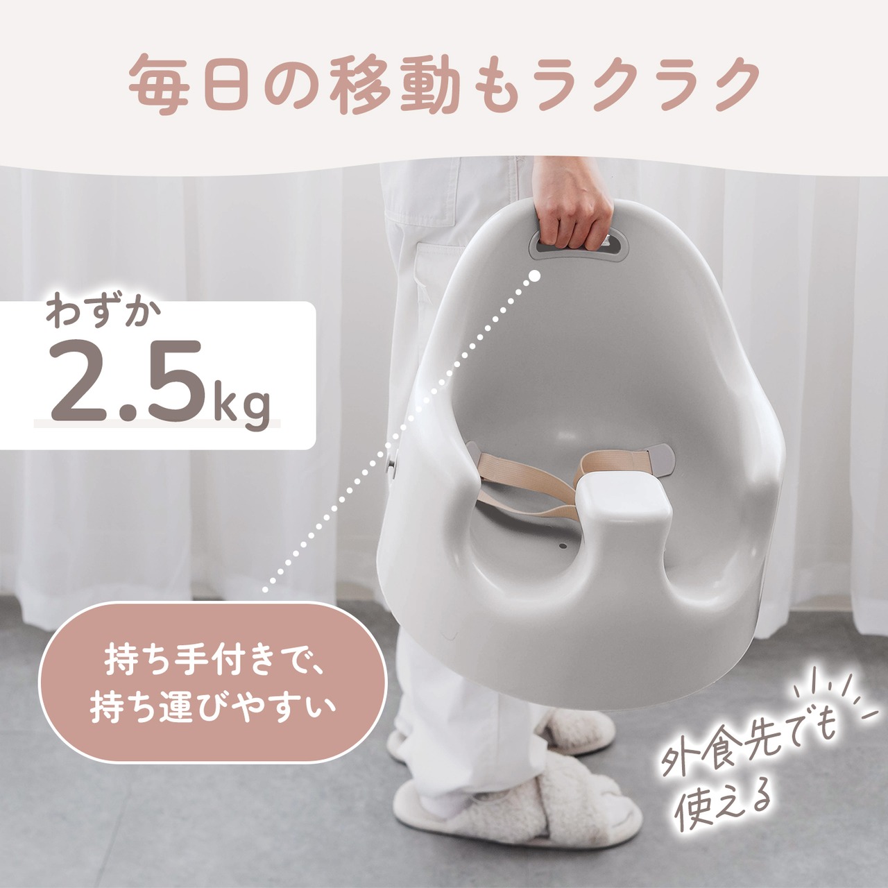軽量設計で、持ち手付き。リビングからダイニングへの移動や、別の部屋で使うときも持ち運びが簡単です。外食先や帰省先など、さまざまなシーンで使いやすい実用的なデザインです。