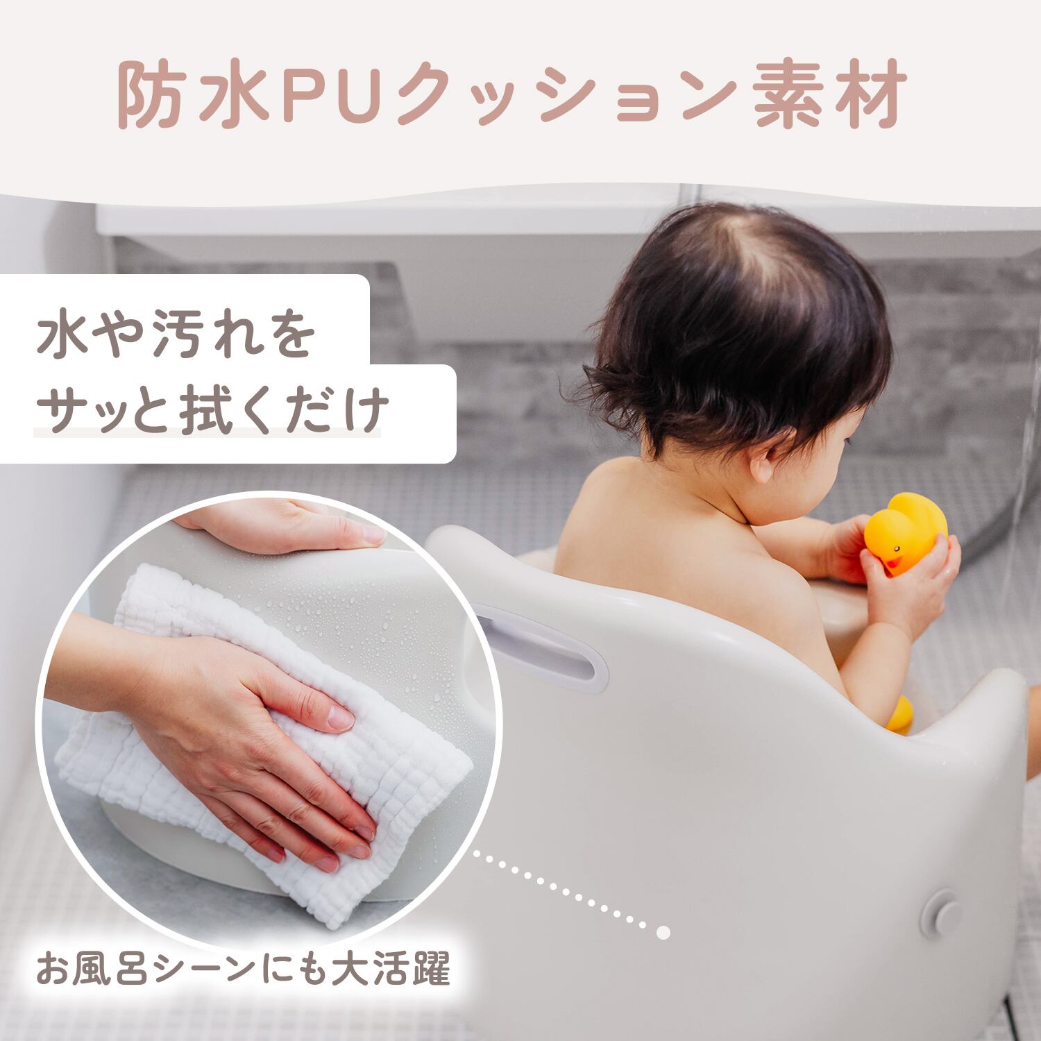本体には防水PUクッション素材を使用。ほどよい弾力があり、赤ちゃんのおしりや背中をやさしく支えます。水や汚れを弾きやすく、食べこぼしや水滴もサッと拭くだけ。お風呂前後の待機チェアとしても使いやすい素材です。
