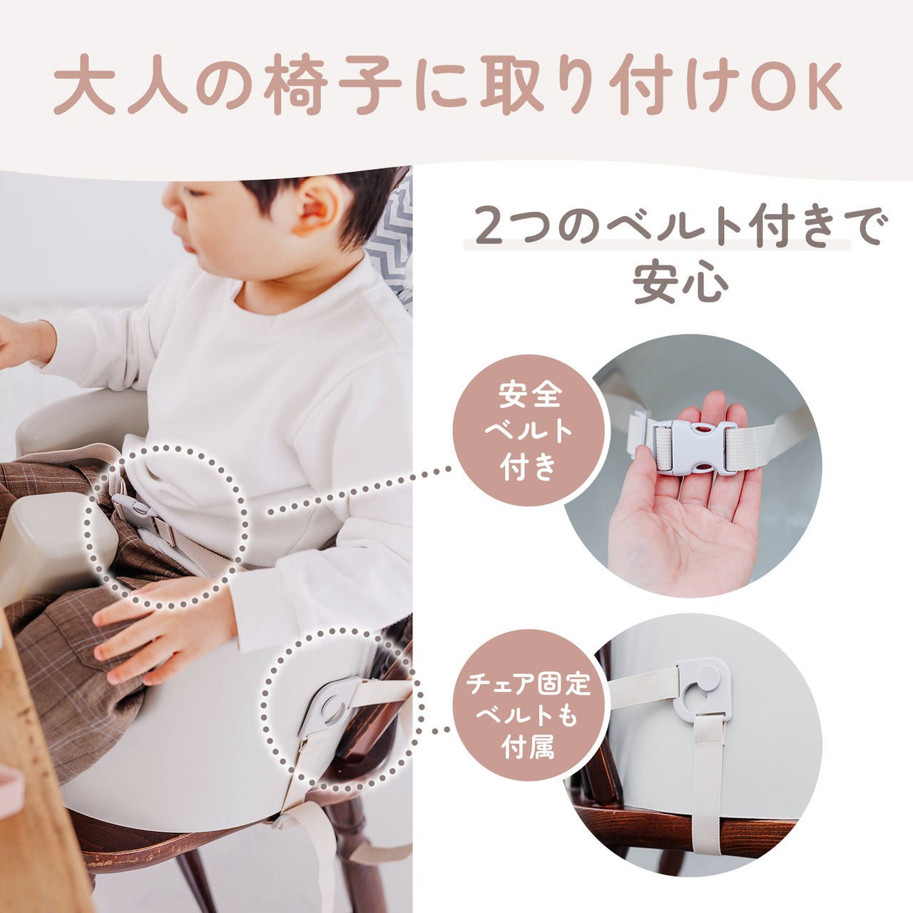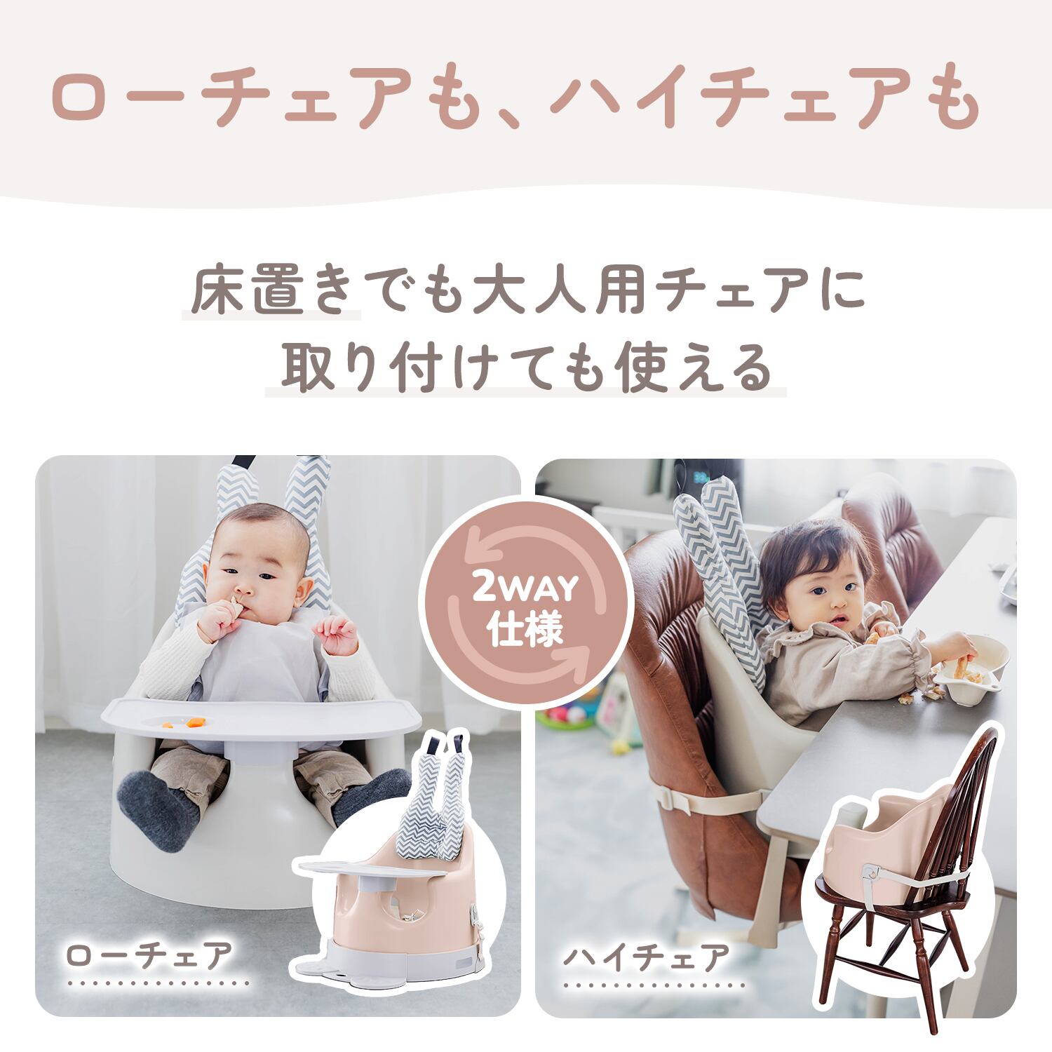床置きで使えるローチェアとしてはもちろん、大人用チェアに取り付けてハイチェアとしても使用できる2WAY仕様。生活スタイルや食事シーンに合わせて使い分けができます。成長に合わせて使えるため、長く活躍するベビーチェアです。