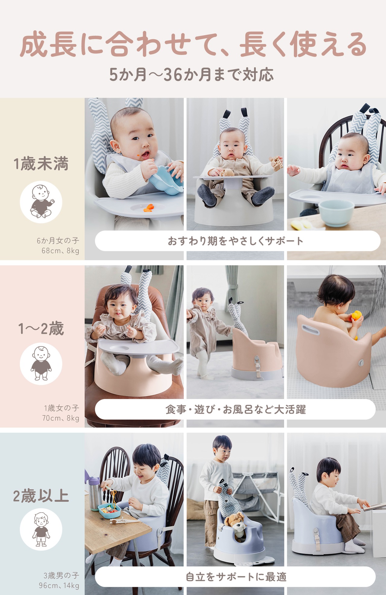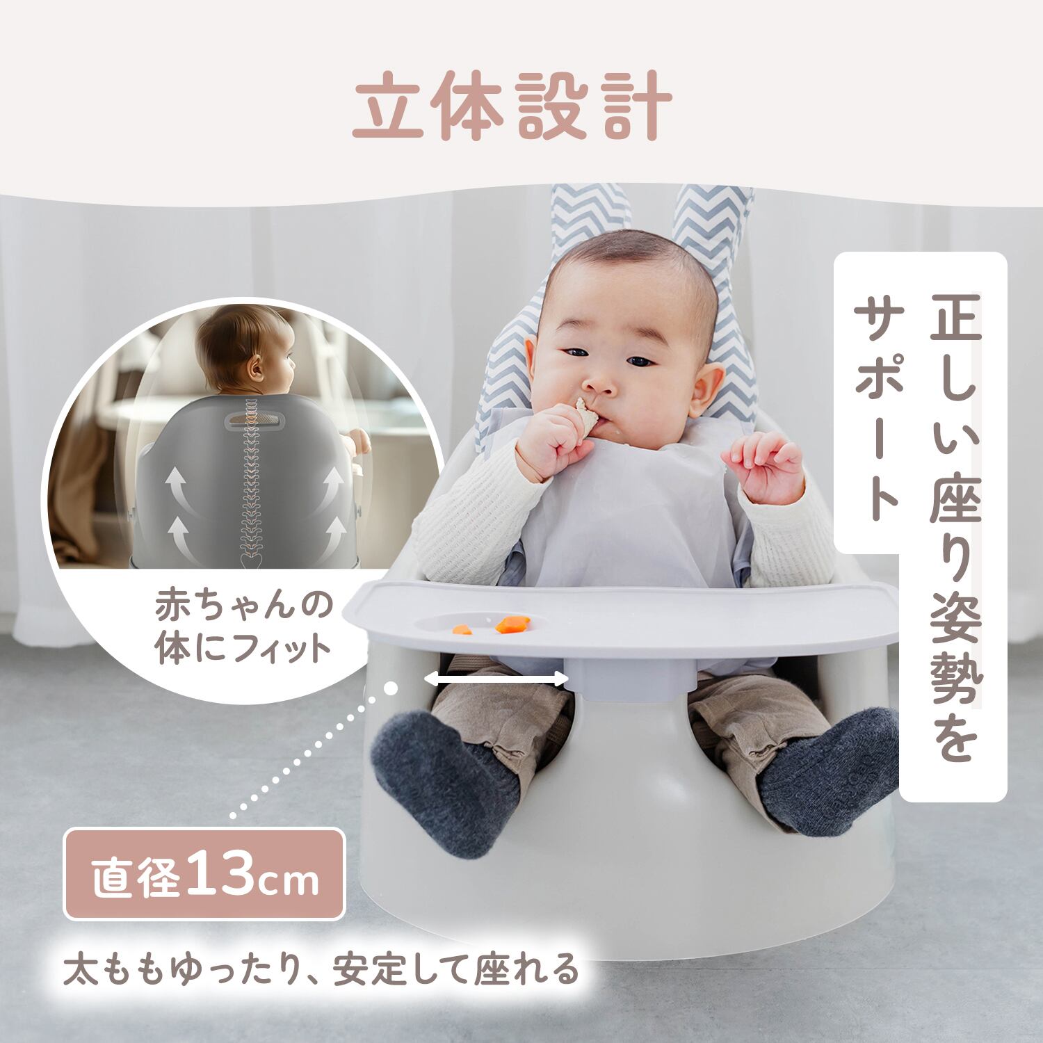 赤ちゃんの体の形に合わせた立体フォルムで、座ったときの姿勢をやさしくサポート。背中からおしりまで自然にフィットし、安定した座り姿勢を保ちやすい設計です。太もも部分にはゆとりを持たせているため、窮屈になりにくく、赤ちゃんも快適に過ごせます。