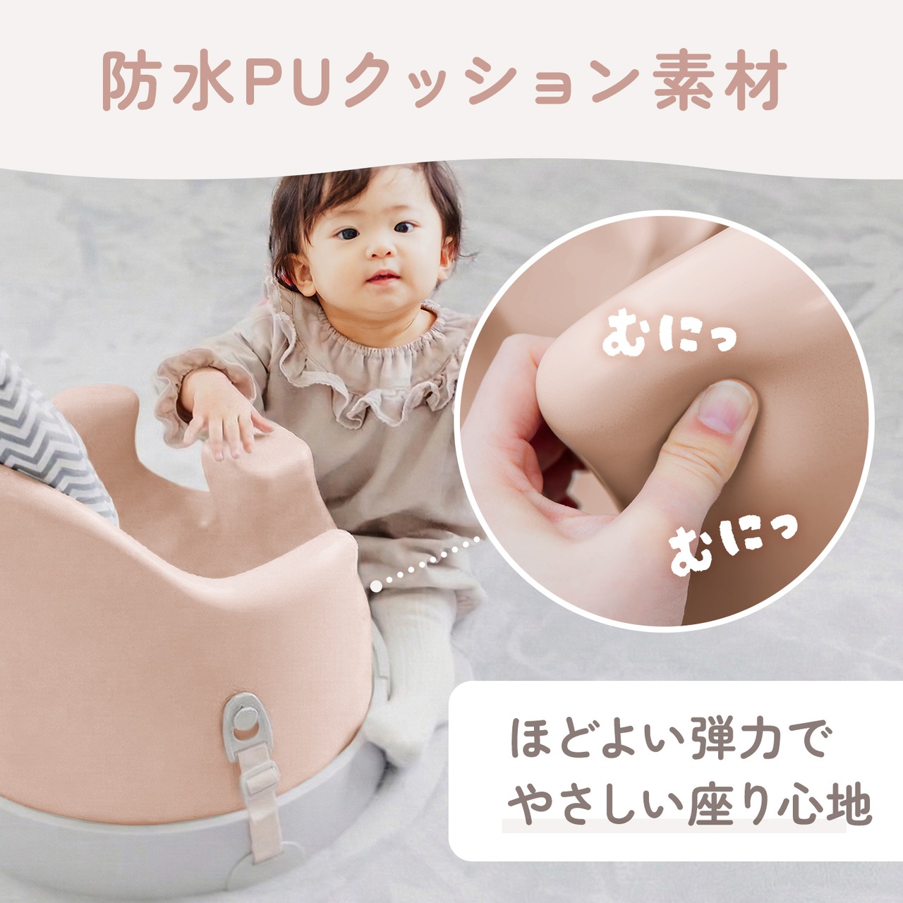 本体には防水PUクッション素材を使用。ほどよい弾力があり、赤ちゃんのおしりや背中をやさしく支えます。水や汚れを弾きやすく、食べこぼしや水滴もサッと拭くだけ。お風呂前後の待機チェアとしても使いやすい素材です。
