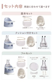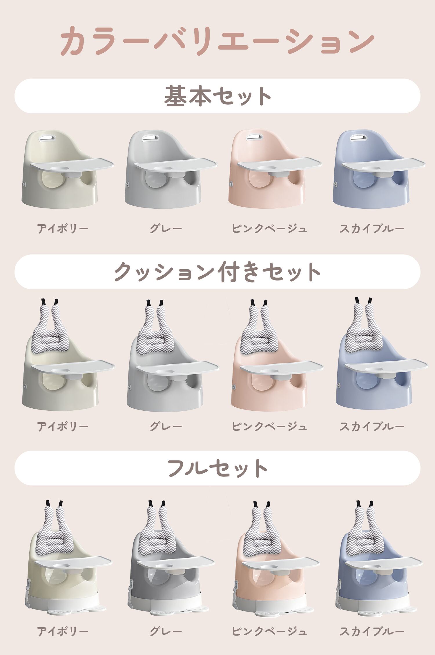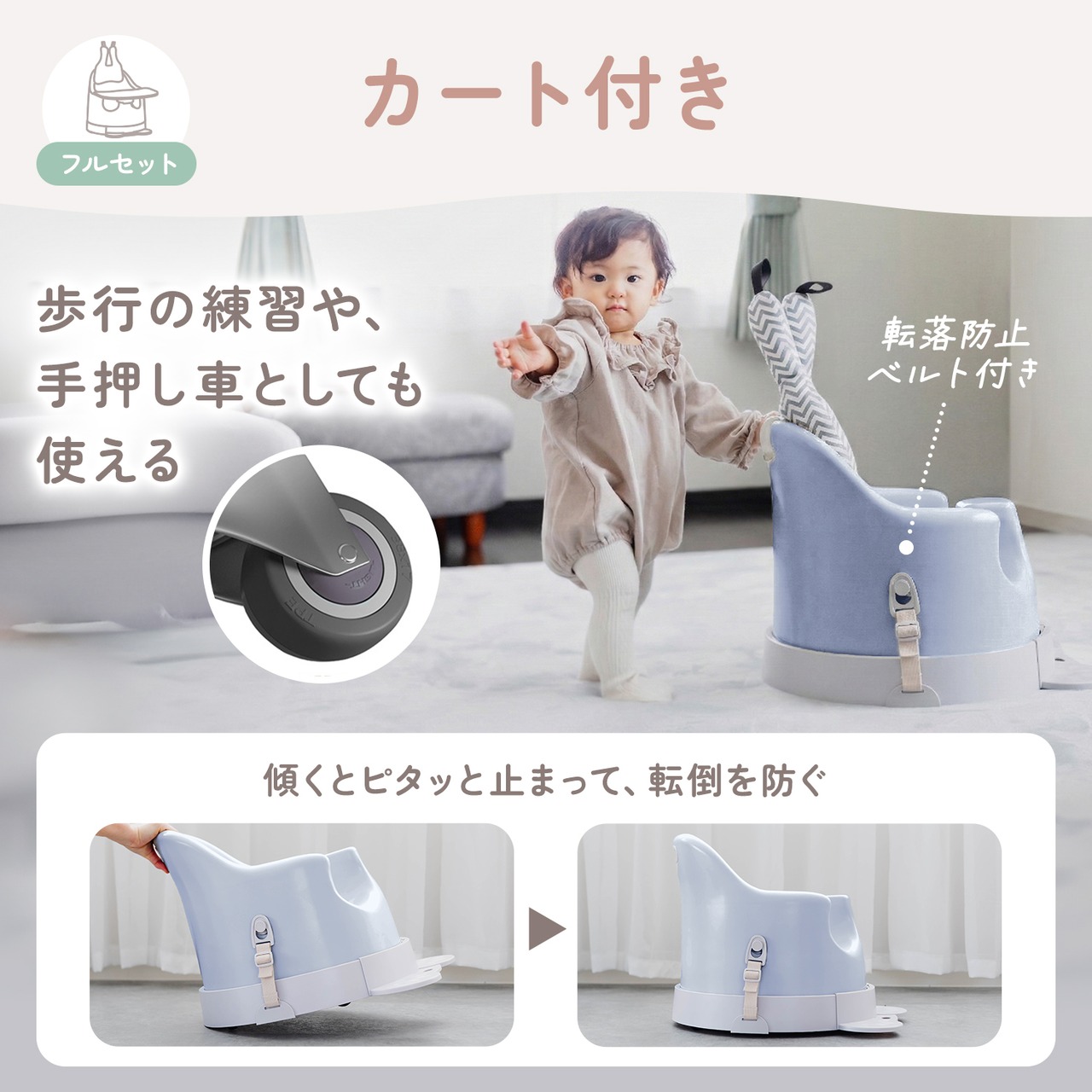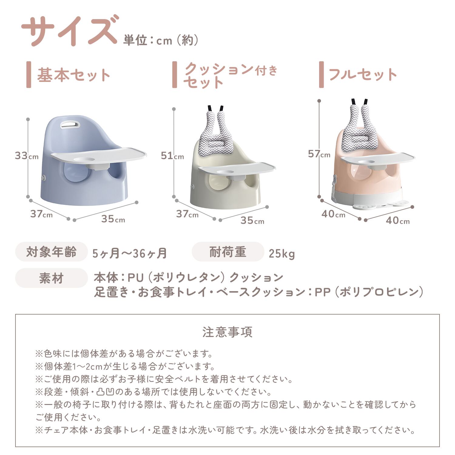 クッション付きセットは、頭までやさしく支える設計。丸みのある形状で椅子にフィットし、赤ちゃんの体をやさしく包み込みます。マジックテープで簡単に取り付けできるため、必要に応じて手軽に使えます。