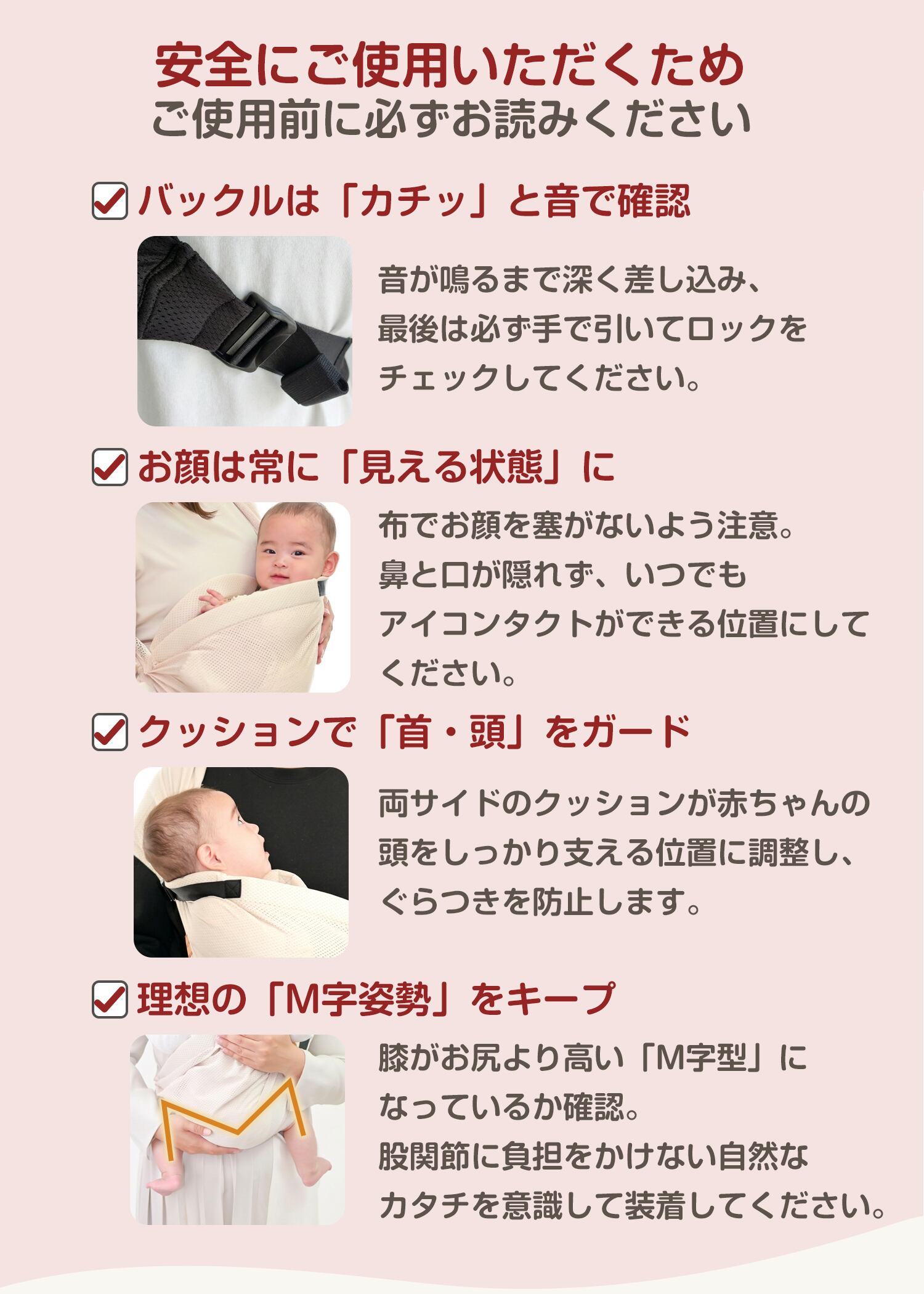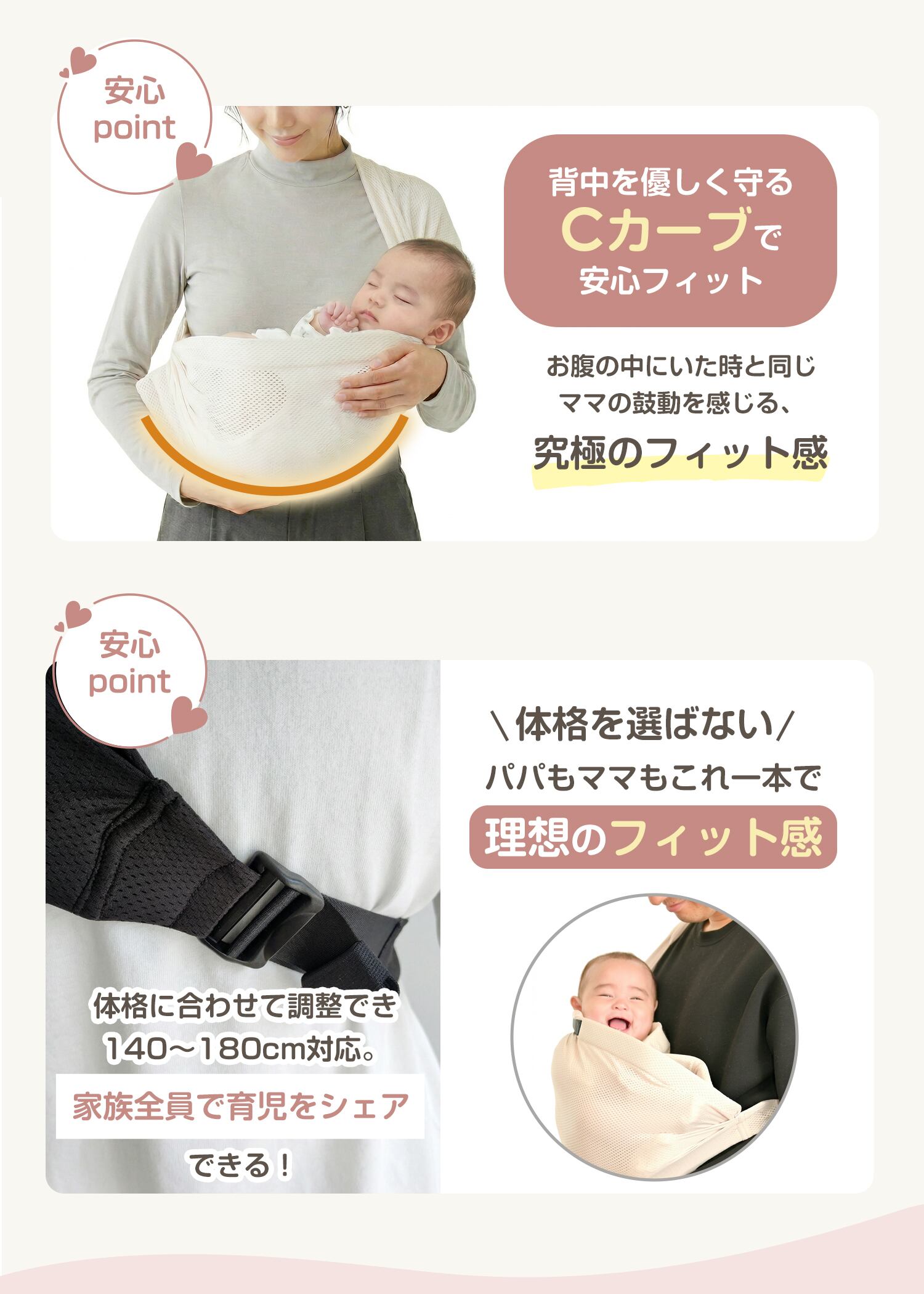 3児の母でもある助産師が「ママの鼓動が伝わる究極の密着感」を追求。新生児のデリケートな背中の「Cカーブ」と、股関節に優しい「M字姿勢」を自然に保てる設計で、赤ちゃんの安心感と健やかな成長をサポートします。